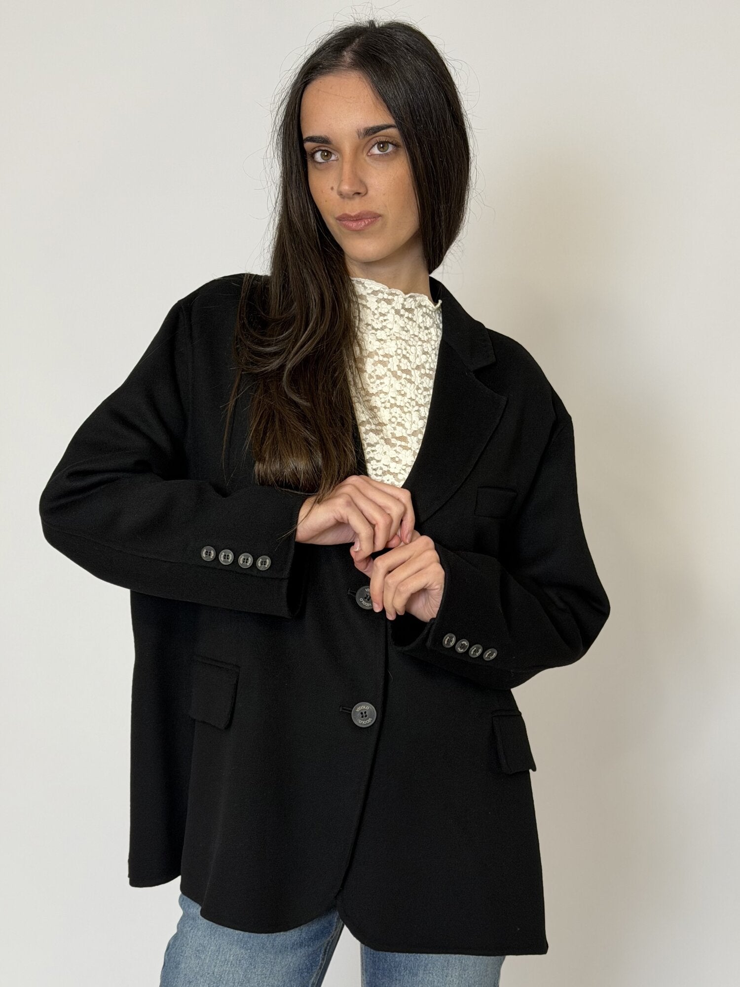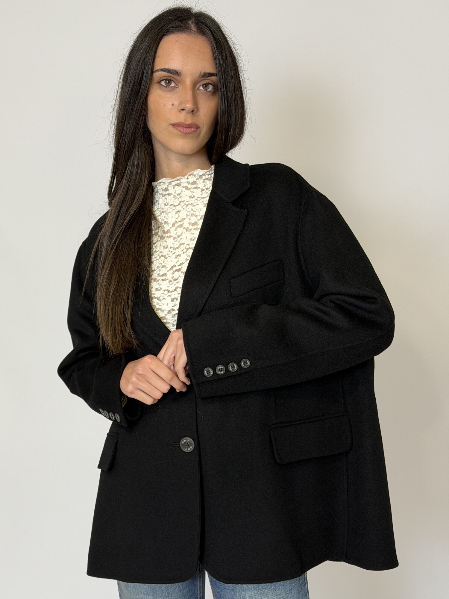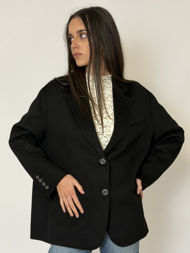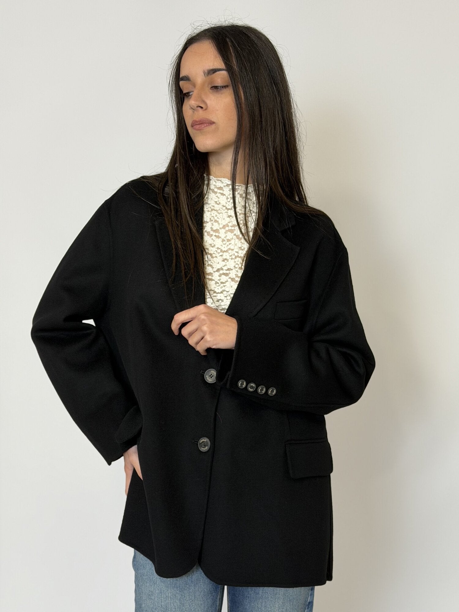 Giacca-cappotto monopetto oversize in panno nero di Vicolo. Giacca blazer monopetto con vestibilità ampia e oversize. Realizzata in panno di lana o tessuto pesante. Dettaglio di revers classici e chiusura con due bottoni frontali. Tasche a pattina. Disponibile nel colore antracite, nero e bordeaux.