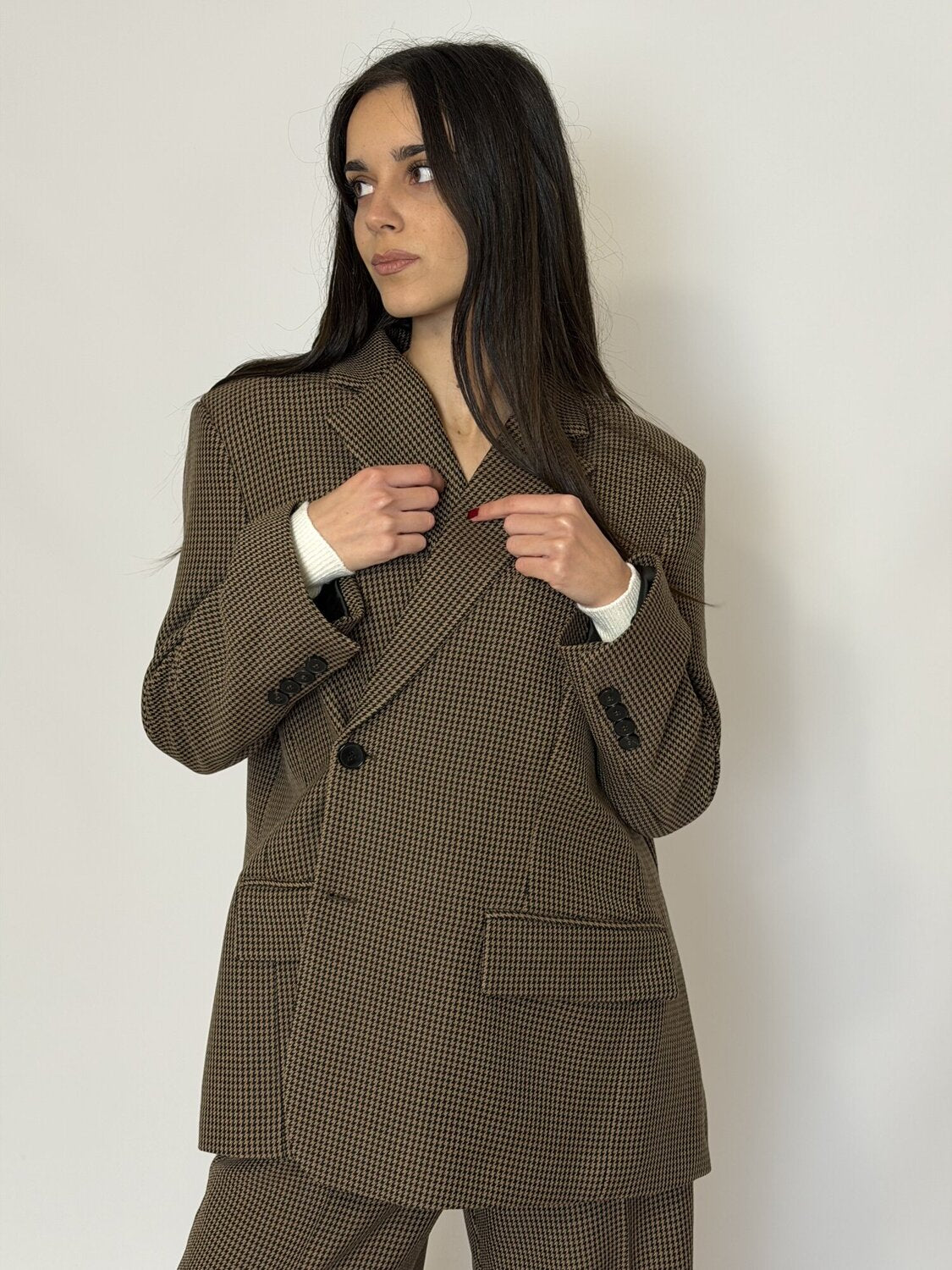 Giacca doppiopetto asimmetrica pied-de-poule marrone di Vicolo. Blazer con vestibilità oversize e un taglio allungato. Realizzato in tessuto con una fantasia micro pied-de-poule o a piccoli quadri nei toni del marrone e beige/nero. Chiusura asimmetrica.