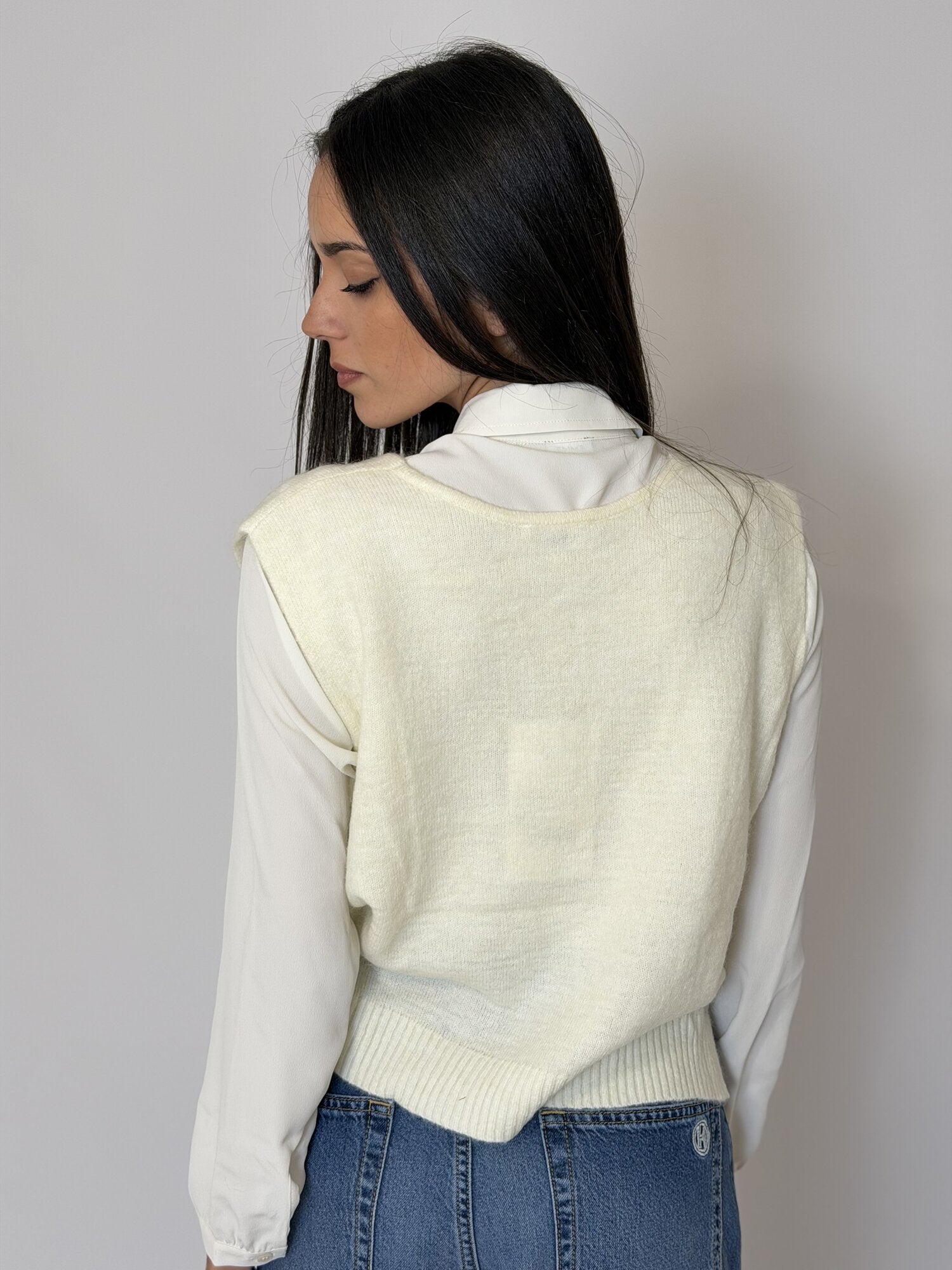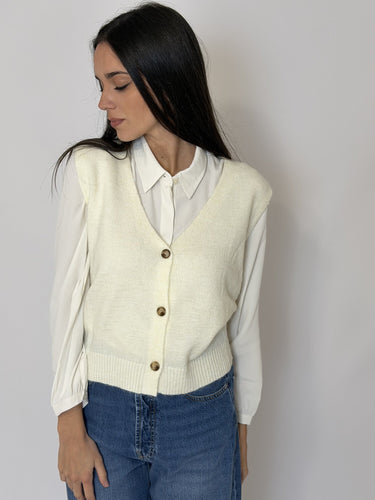 Gilet Santa panna di Grace & Mila. Cardigan lavorato a maglia. Vestibilità dritta. Senza maniche. Scollo a V. Apertura frontale con bottoni. Spacchi laterali. Disponibile nel colore beige, panna e moro.