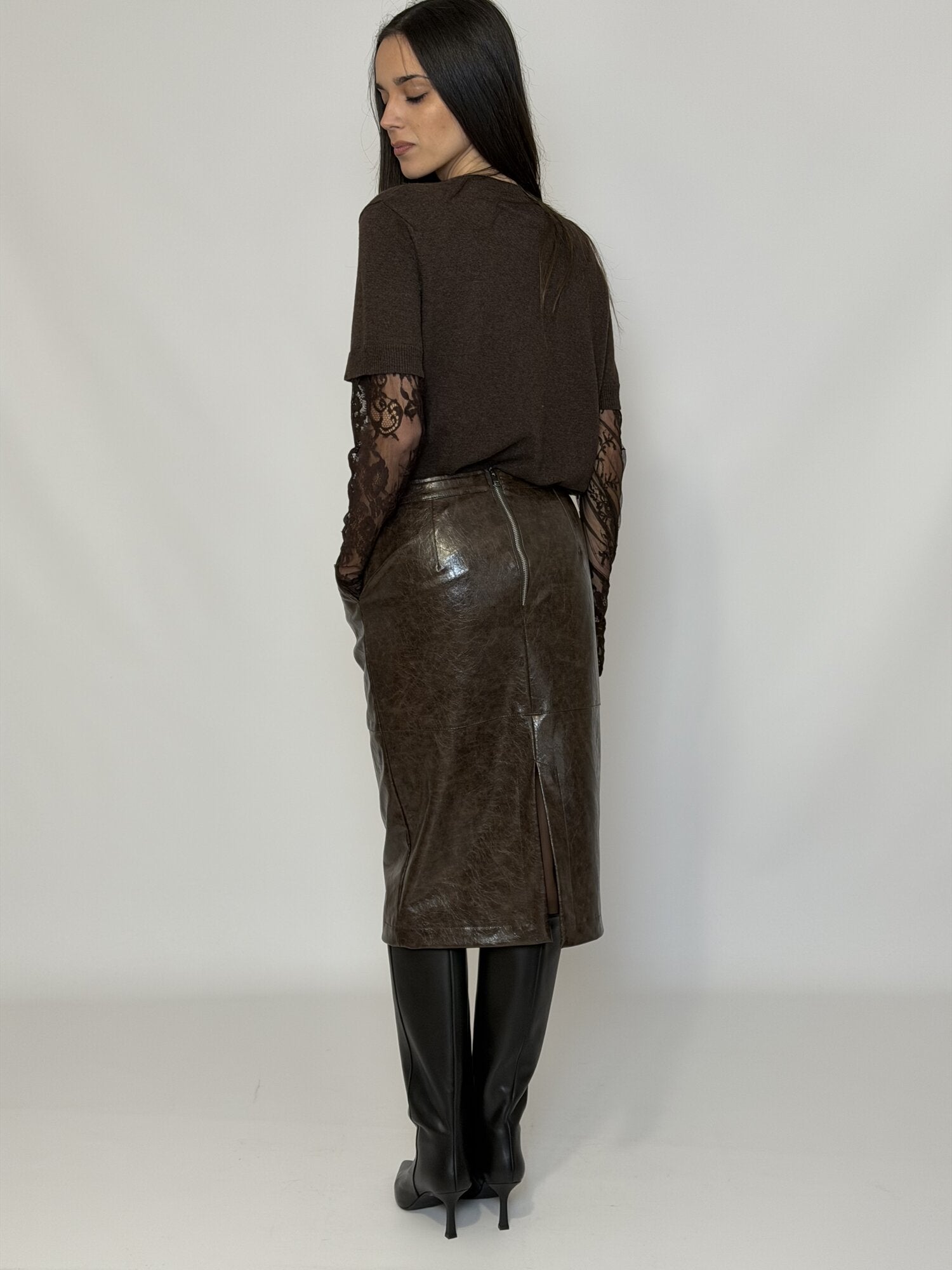 Gonna Midi Texture Moro di Vicolo. Gonna midi dritta in ecopelle, modello texturizzato con tasche laterali e cerniera sul retro. Disponibile in moro.