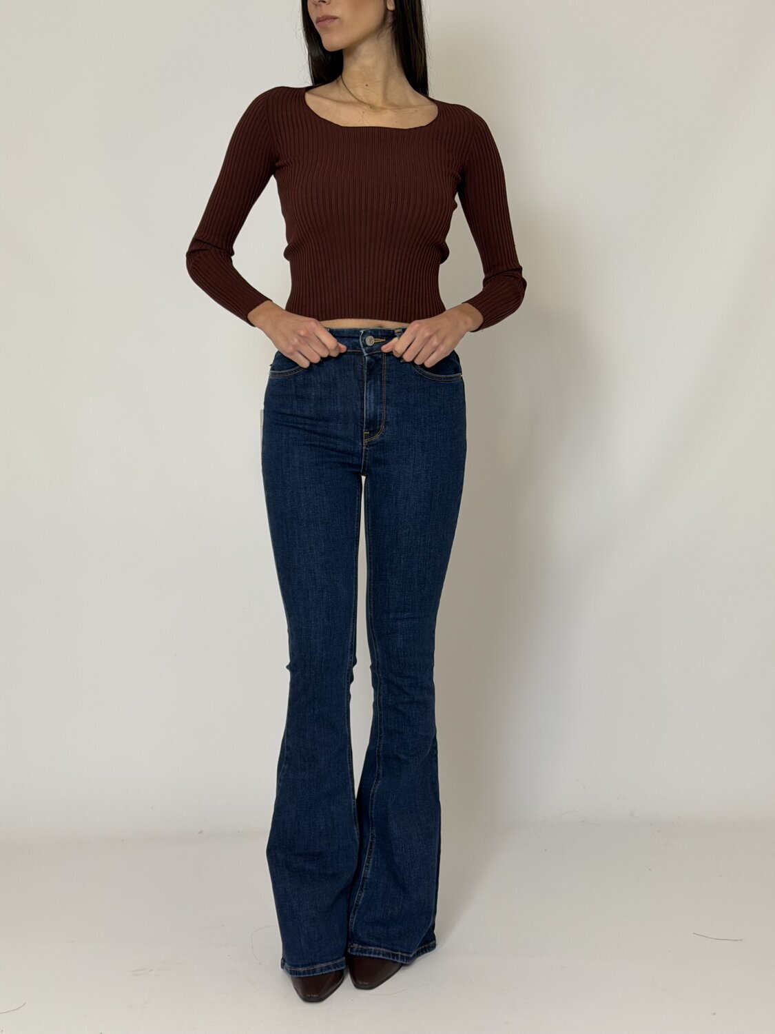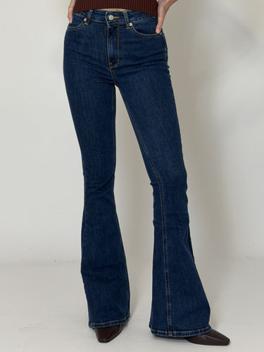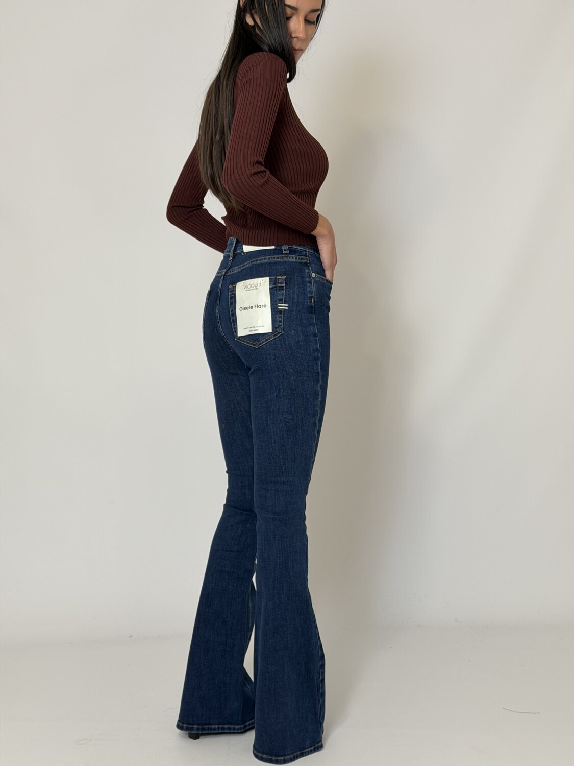 Jeans flare Gisele blu denim di Vicolo. Jeans in denim elasticizzato a vita alta con vestibilità aderente sulla coscia e taglio a zampa ampio dal ginocchio in giù. Lavaggio uniforme e cuciture a contrasto. Vestibilità aderente in vita. Disponibili nel colore blu denim .