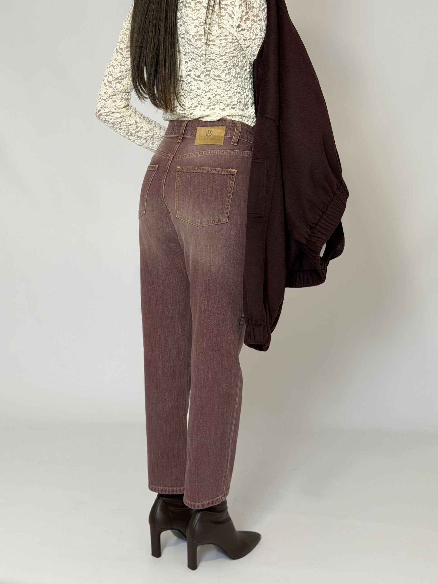Jeans mom fit Louis malva di Haveone. Jeans 5 tasche a vita alta, modello momfit, con passanti per cintura in vita. Chiusura con cerniera e bottone. Disponibile nel lavaggio blu denim, grigio, nero, cammello, malva e slavato.