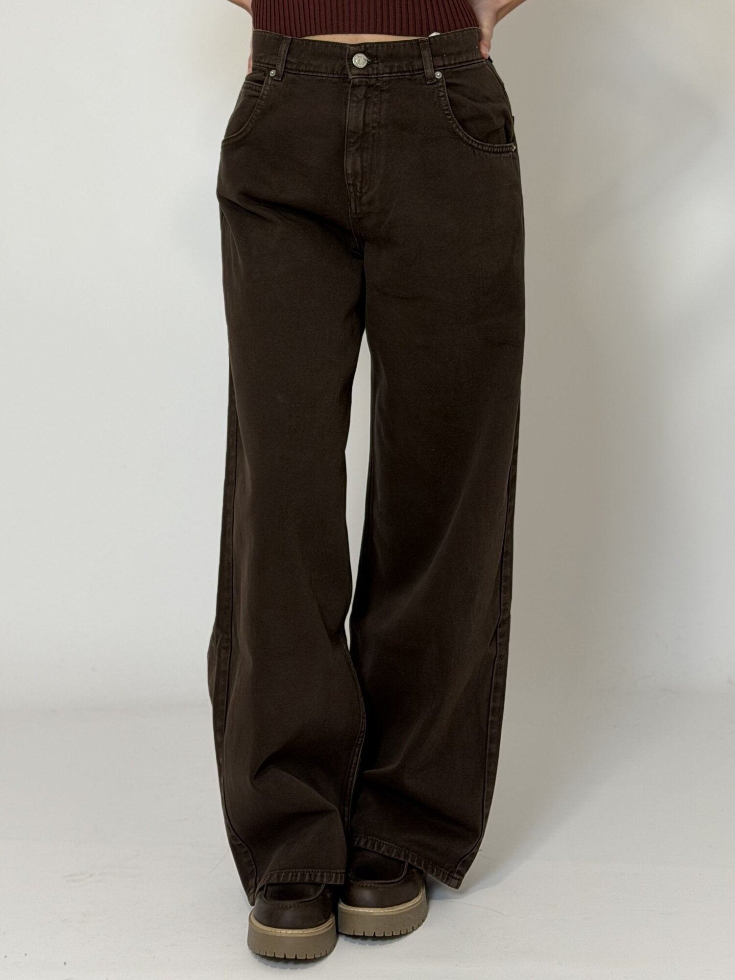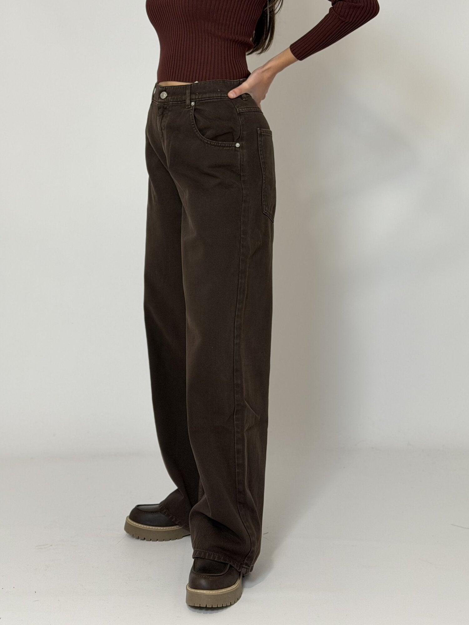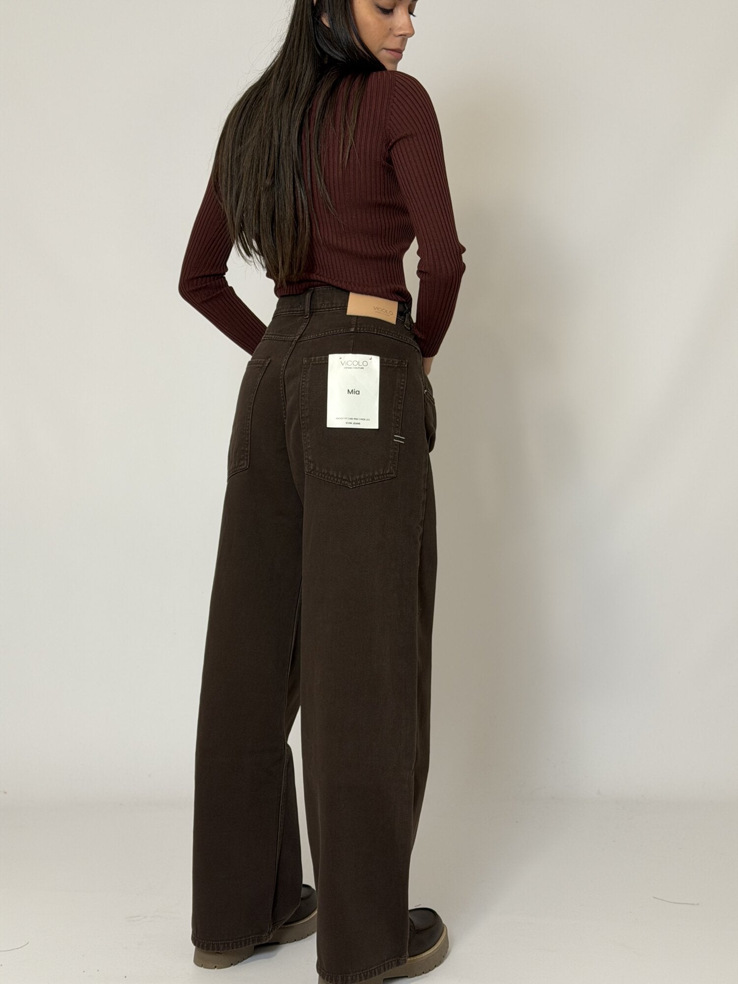 Jeans wide leg Mia moro di Vicolo. Jeans in denim rigido a vita alta con vestibilità dritta e taglio largo/palazzo. Dettaglio di lavaggio uniforme e vestibilità morbida e destrutturata. Chiusura con bottone e zip. Disponibili nel colore moro.