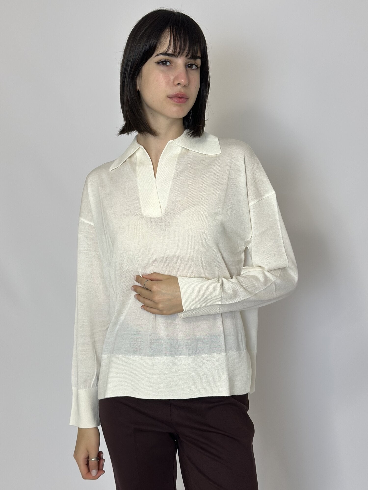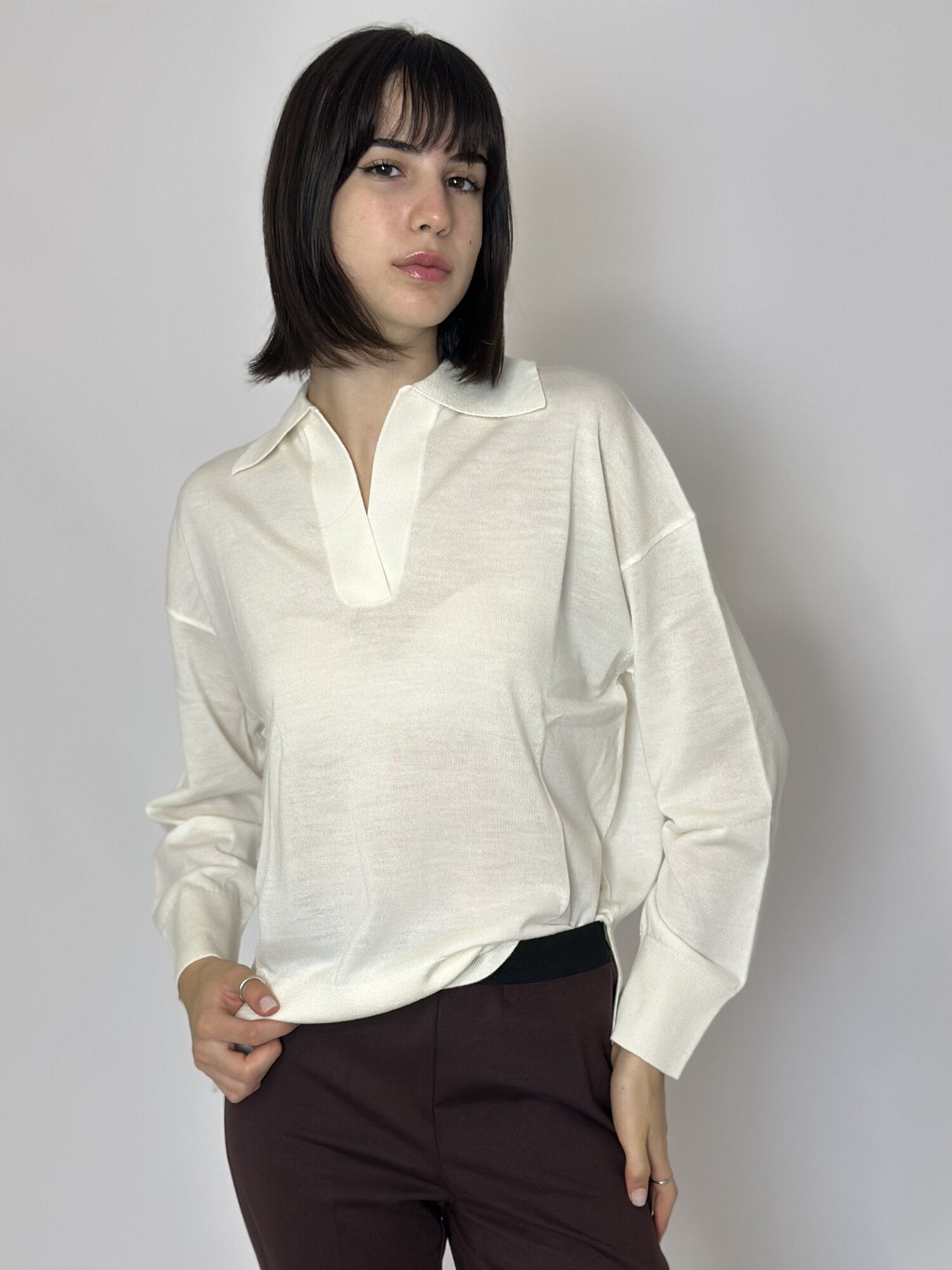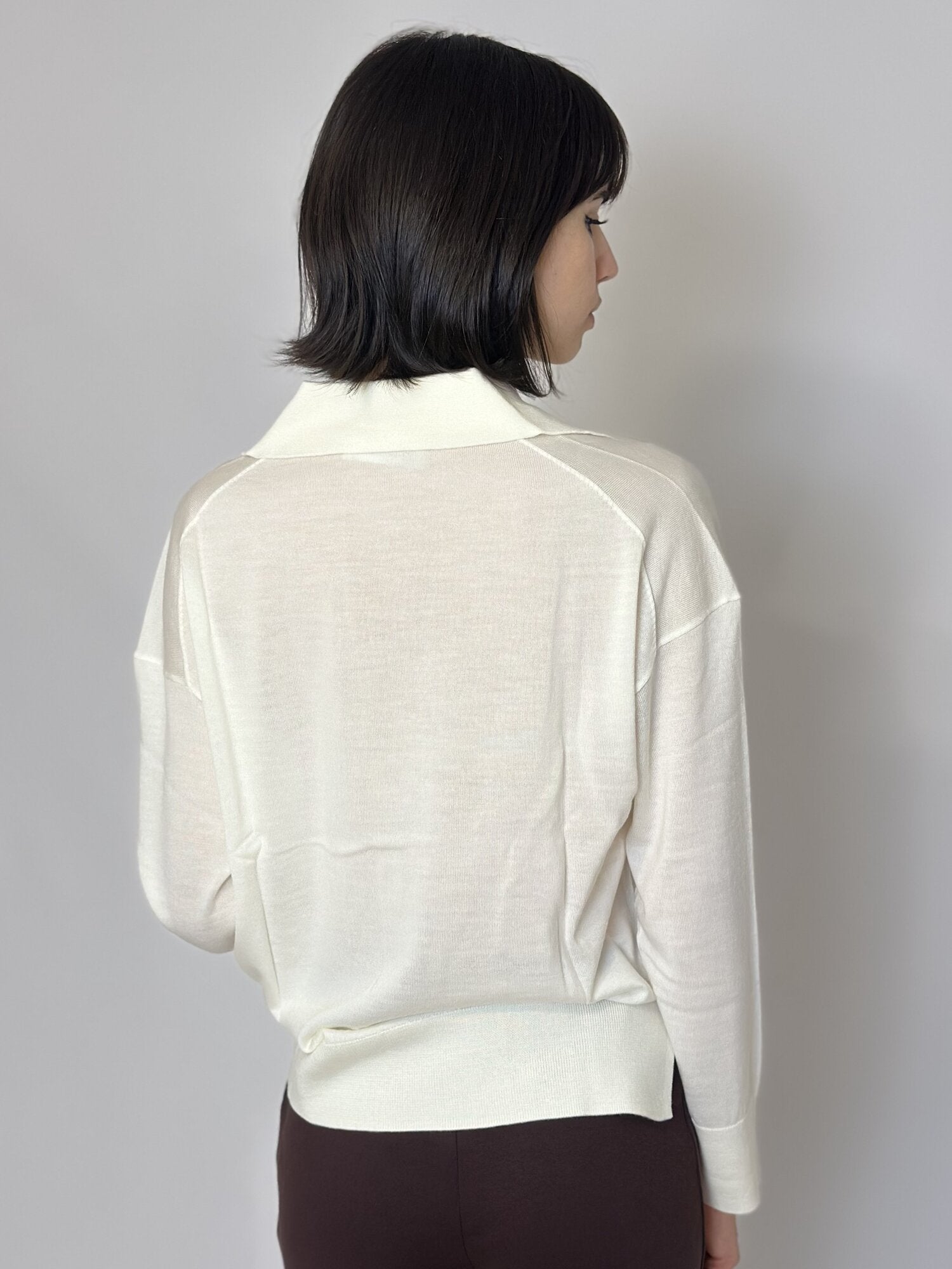 Polo scolo a V Panna di MeimeiJ. Polo in lana merinos a maniche lunghe e scollo a V con colletto classico senza bottoni. Vestibilità morbida. Disponibile in panna.