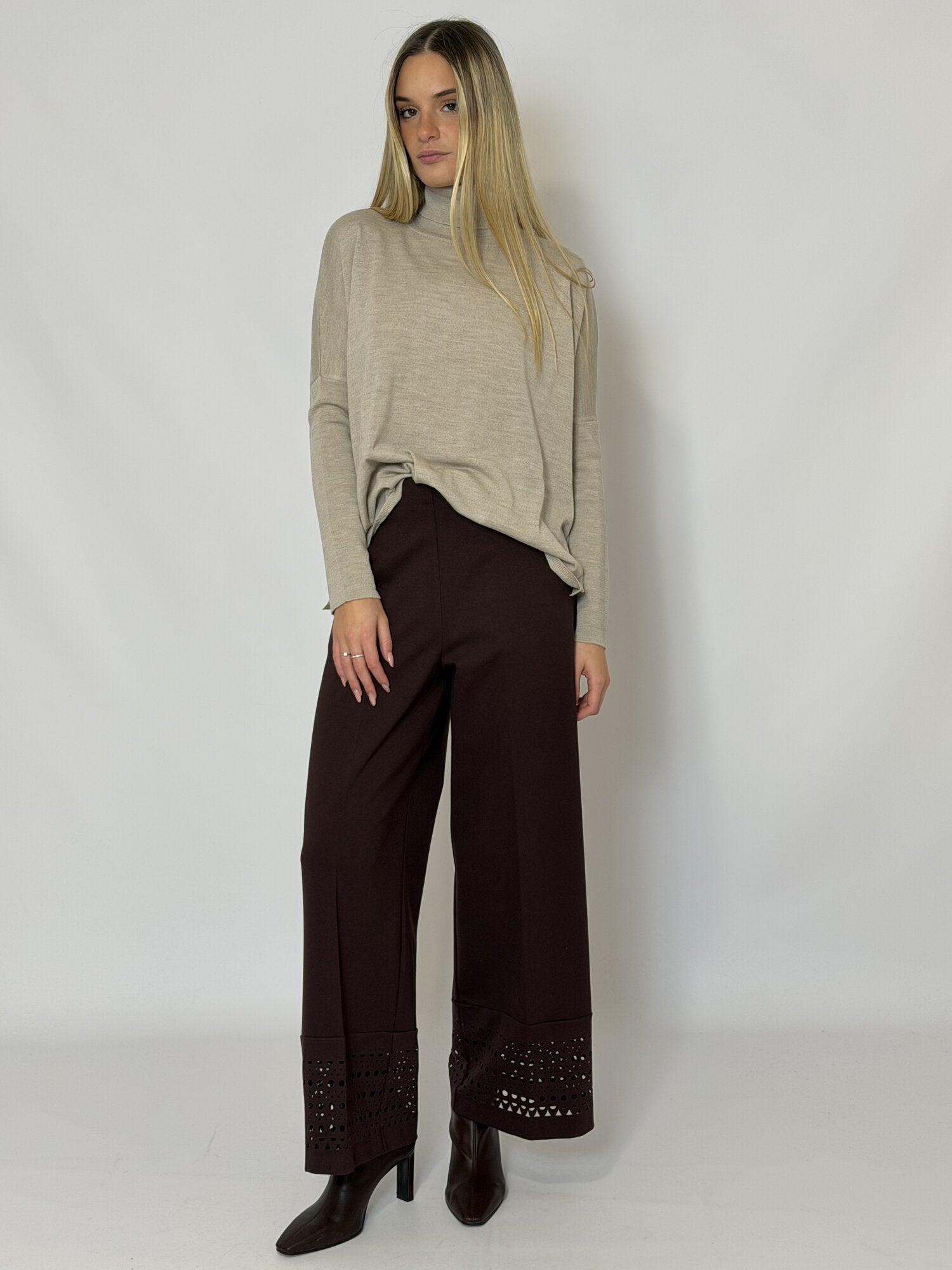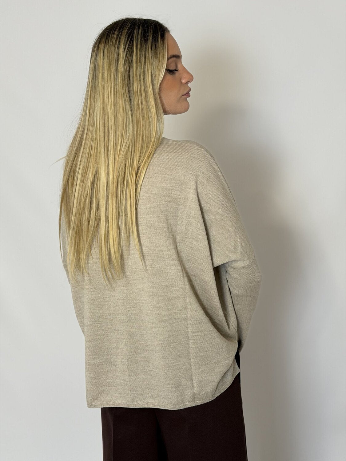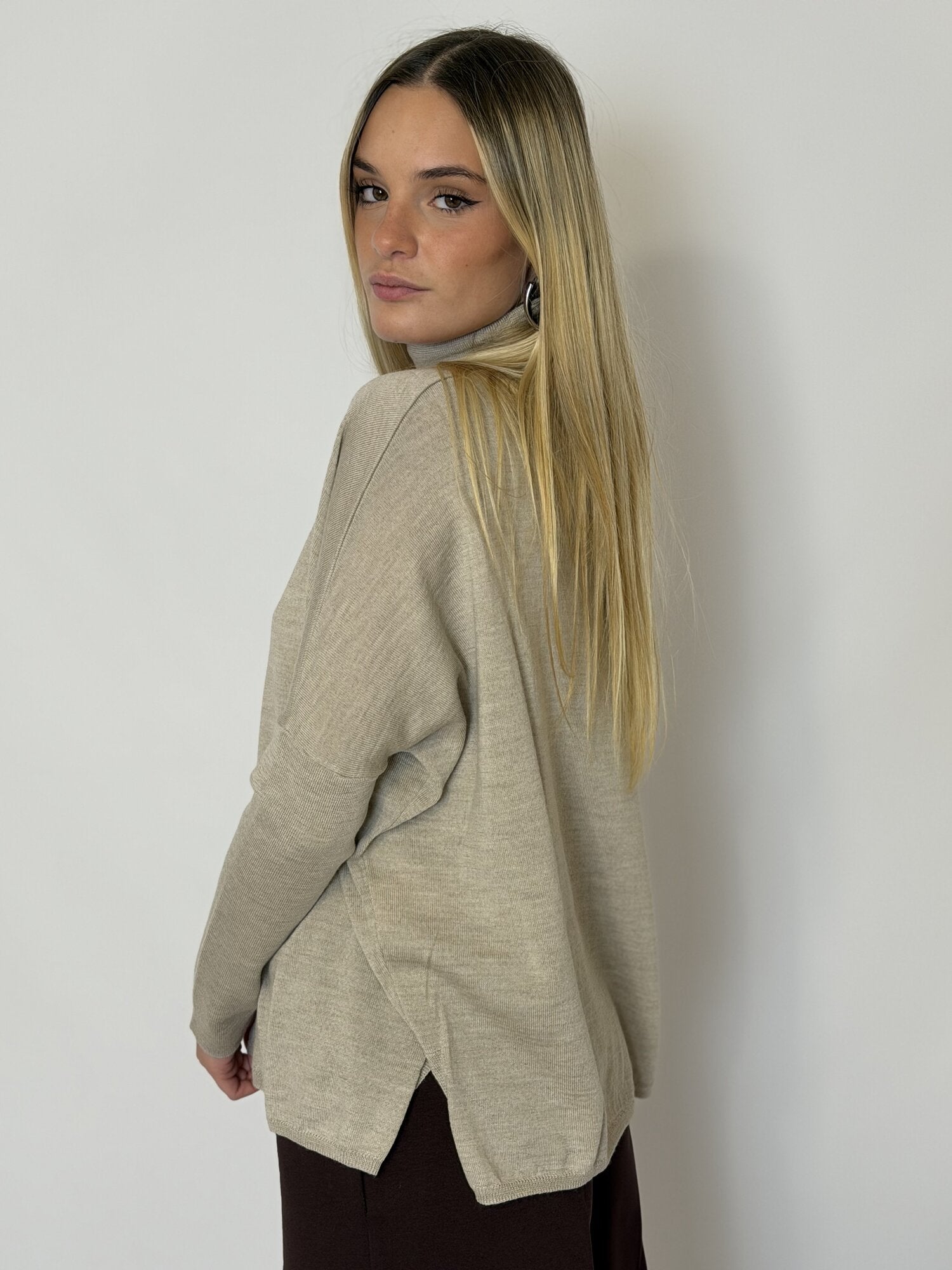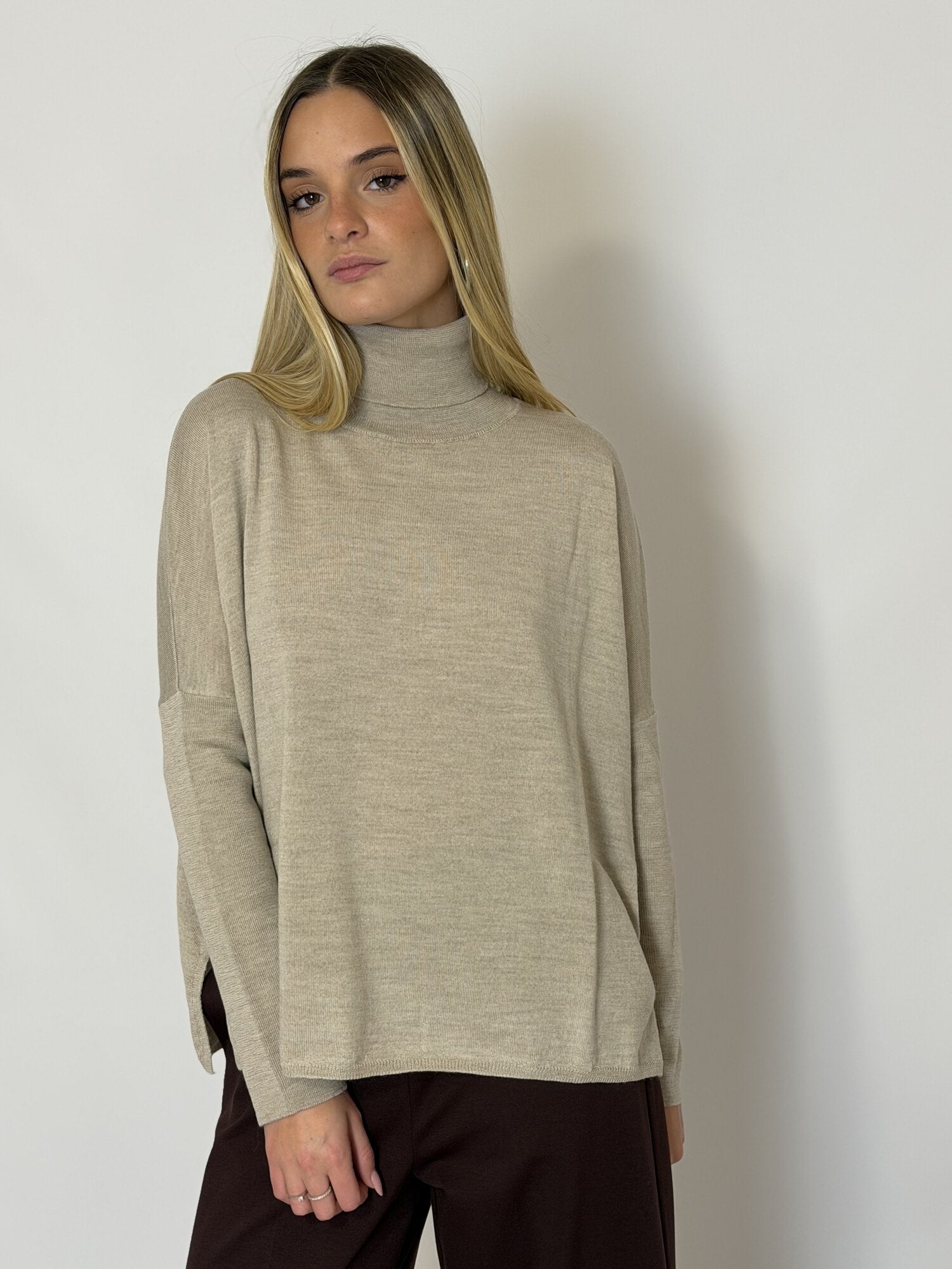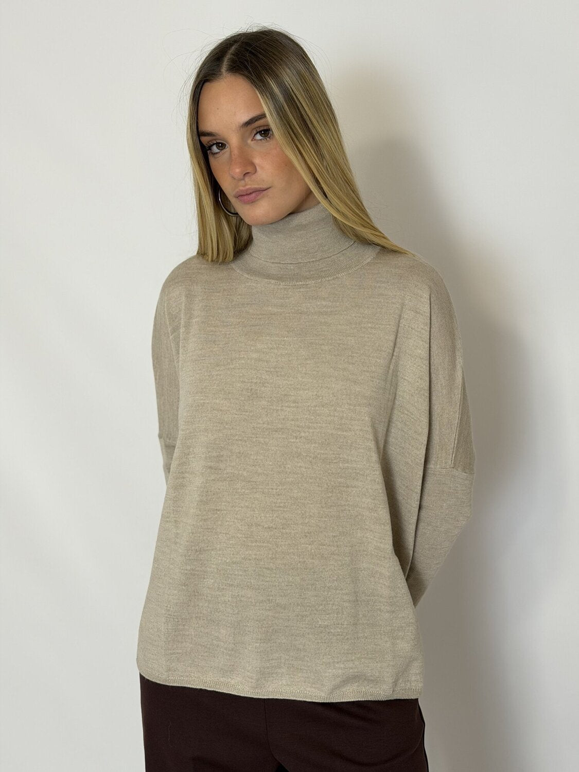 Maglia Collo Alto Beige di Meimei J. Maglia a maniche lunghe con collo alto a coste, vestibilità morbida con spalla scesa. Disponibile in beige e tabacco.