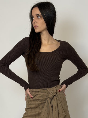 Maglia a maniche lunghe in maglia a costine color moro di Vicolo. Maglia a maniche lunghe con vestibilità aderente/stretta.Realizzata in maglia a costine. Presenta uno scollo a U o arrotondato. Disponibile in moro, rosso, viola, panna.
