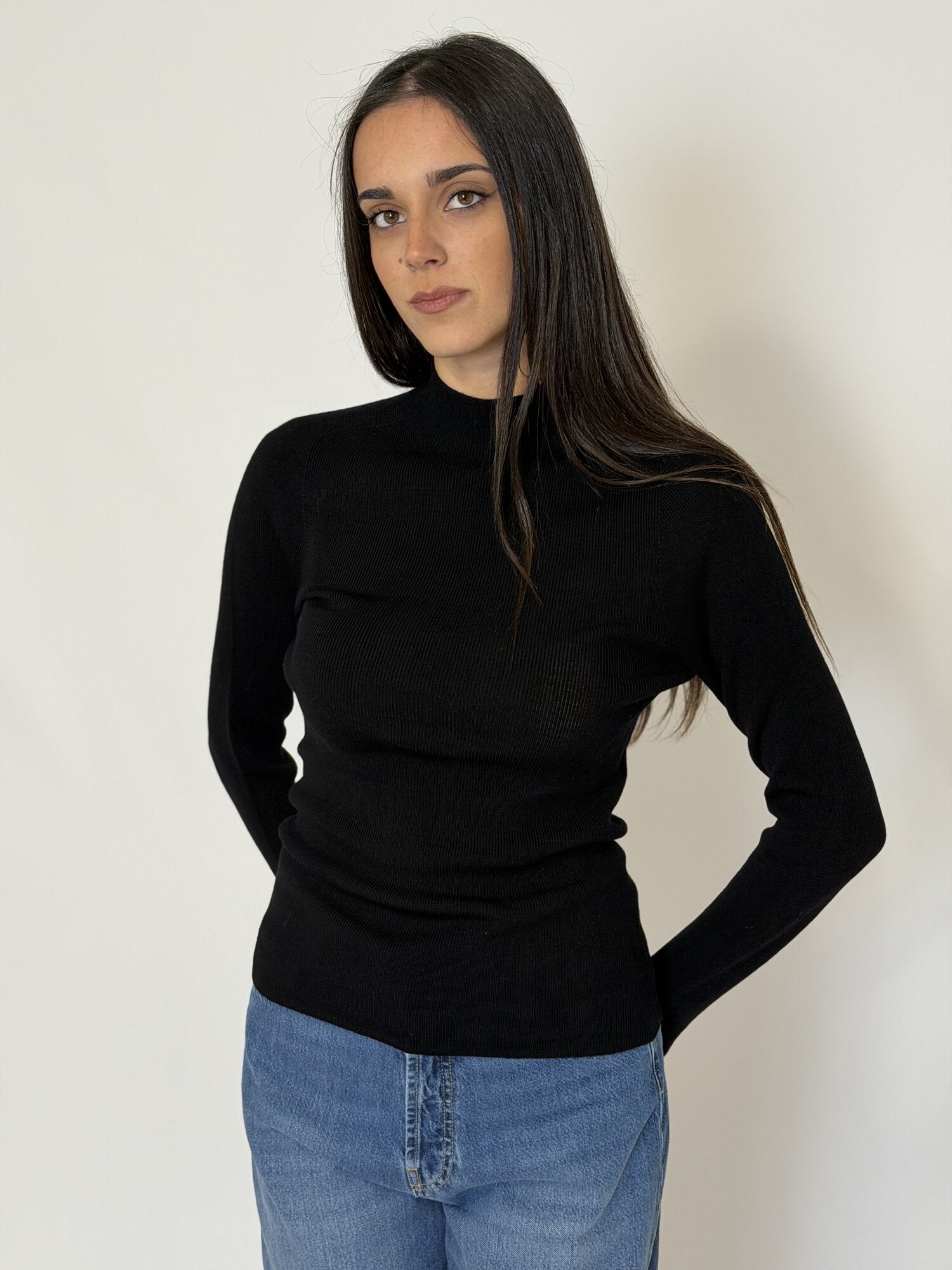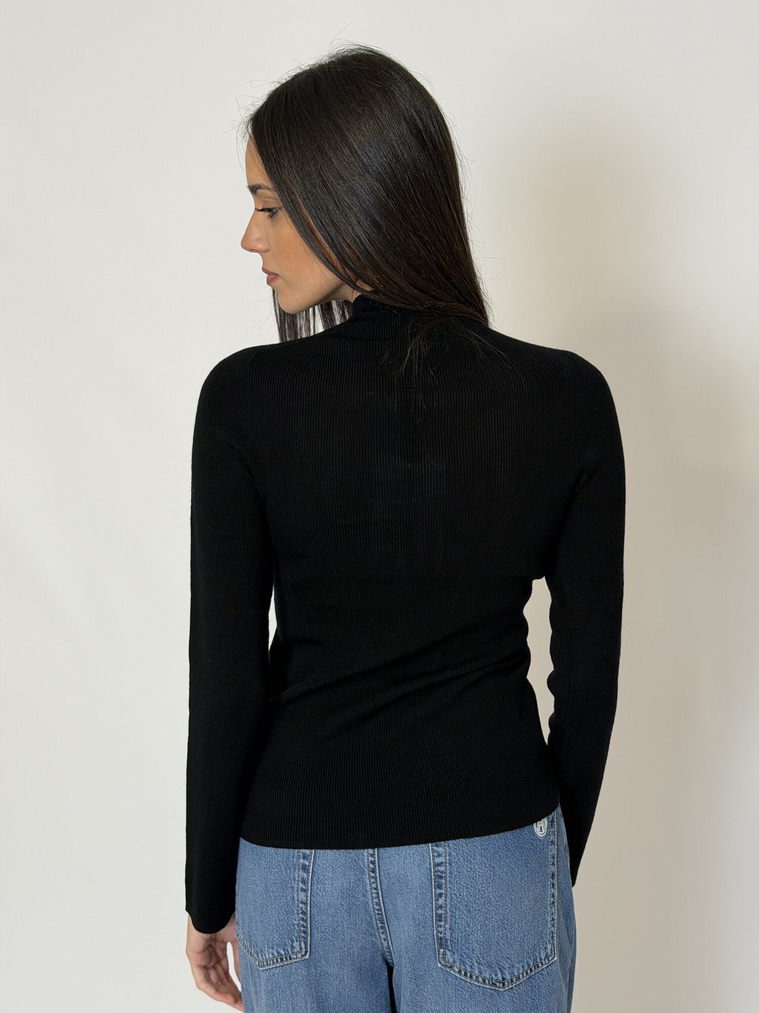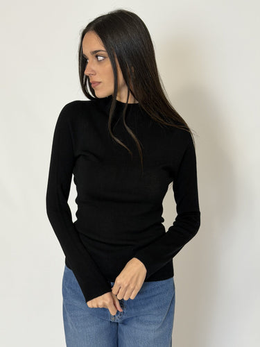 Maglia lupetto nero di Haveone. Maglia basic a costine con mezzo collo e maniche lunghe, vestibilità aderente. Taglia unica. Disponibile in nero e grigio.