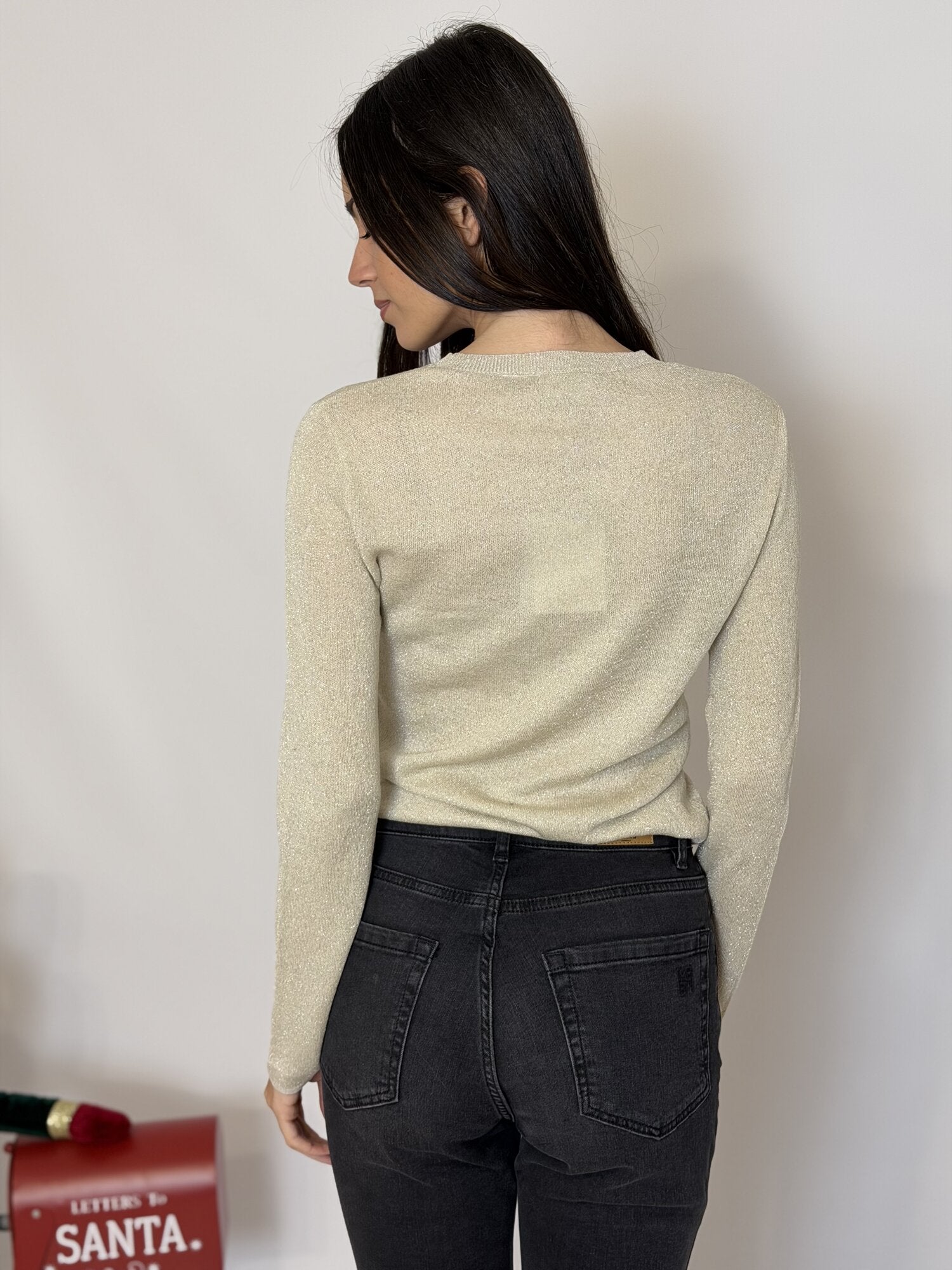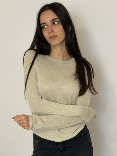 Maglia slim in filato lurex con manica lungo e scollo tondo. Lunghezza: cm 58. Disponibile nel colore platino.