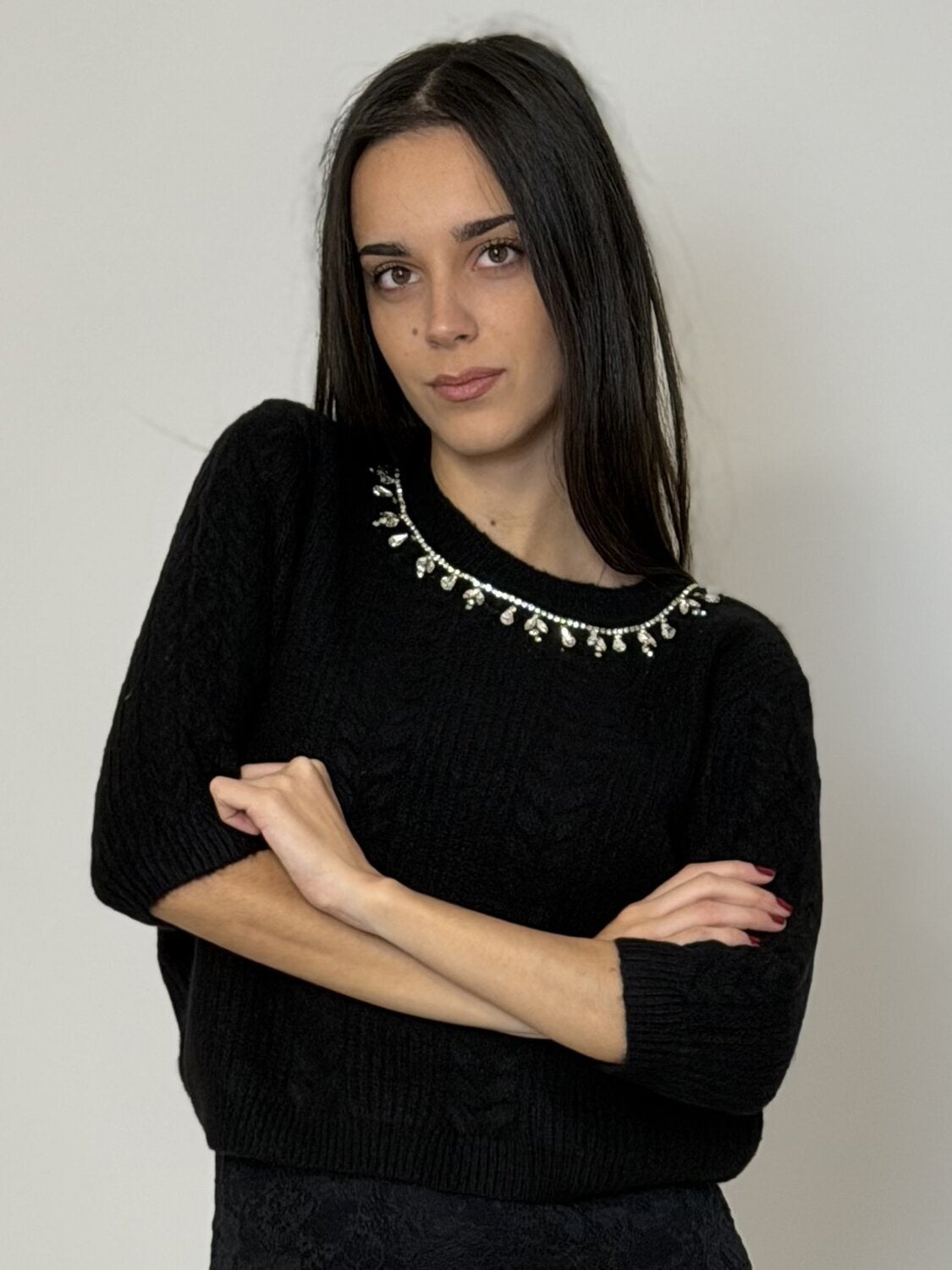 Maglia in filato misto alpaca con applicazione gioiello lungo lo scollo davanti; manica al gomito, scollo tondo e lavorazione a trecce sul davanti e manica. Lunghezza: cm 52. Disponibile in nero.