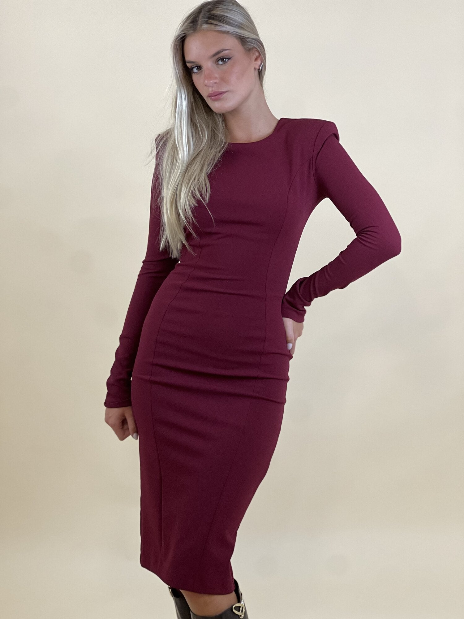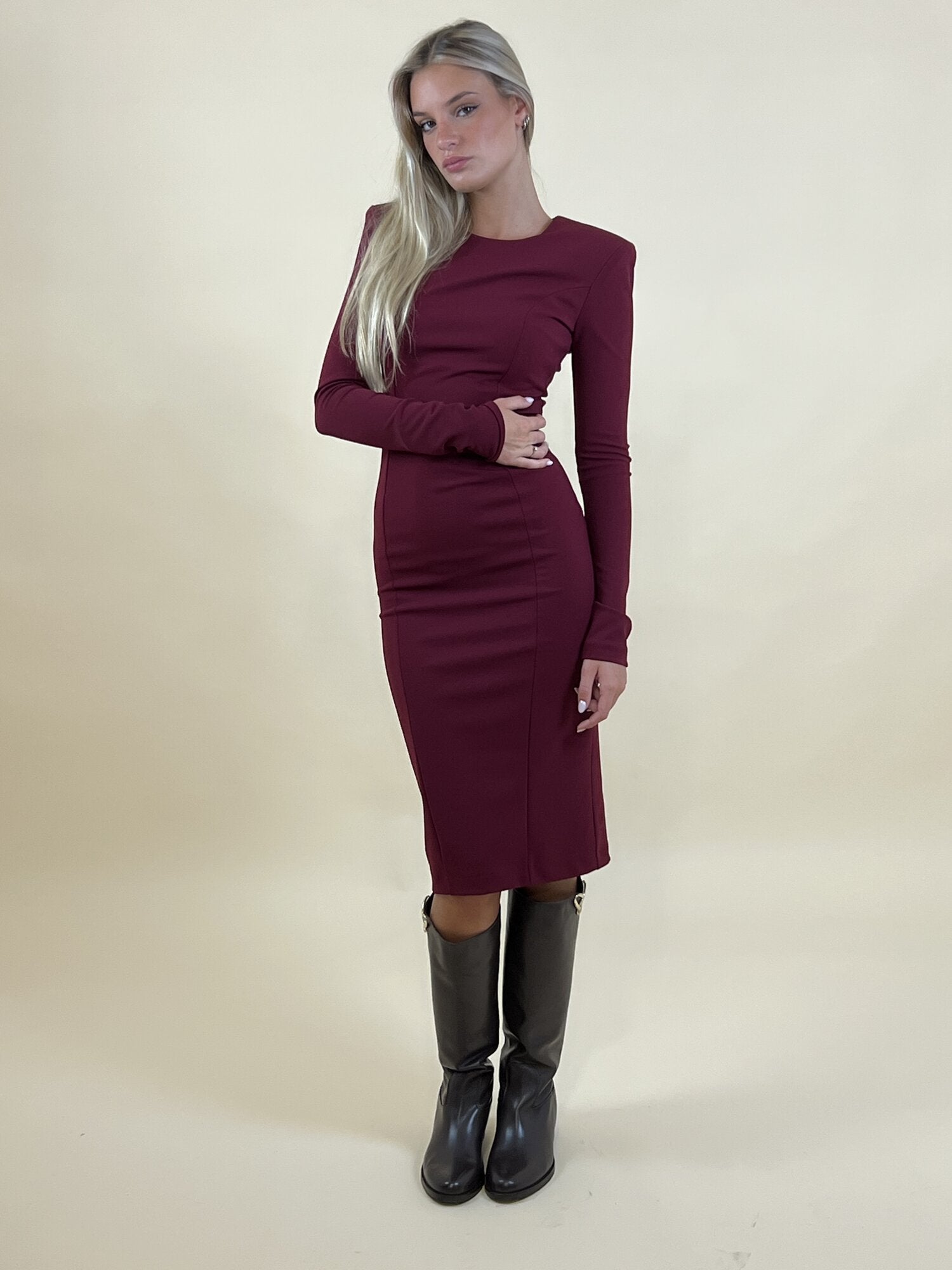 Midi Dress Sienna Bordeaux di Aniye By. Abito midi in tessuto stretch dalla vestibilità aderente. girocollo e maniche lunghe. Chiusura con zip sul retro e tirazip logata. Disponibile in nero e bordeaux.