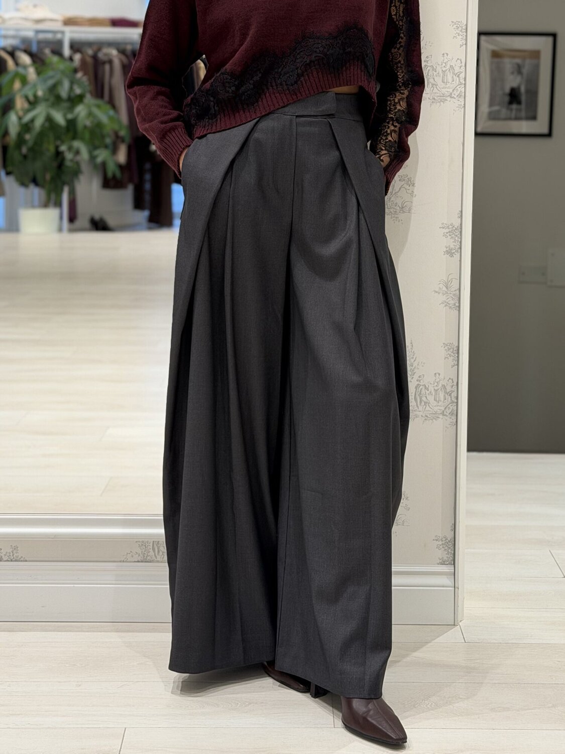 Pantagonna palazzo con pences antracite di Vicolo. Pantagonna a vita alta con vestibilità ampia e fluida e taglio palazzo. Dettaglio di ampie pence sul davanti che creano volume e tasche oblique laterali. Vestibilità morbida e lunghezza lunga. Disponibile nel colore moro e antracite.