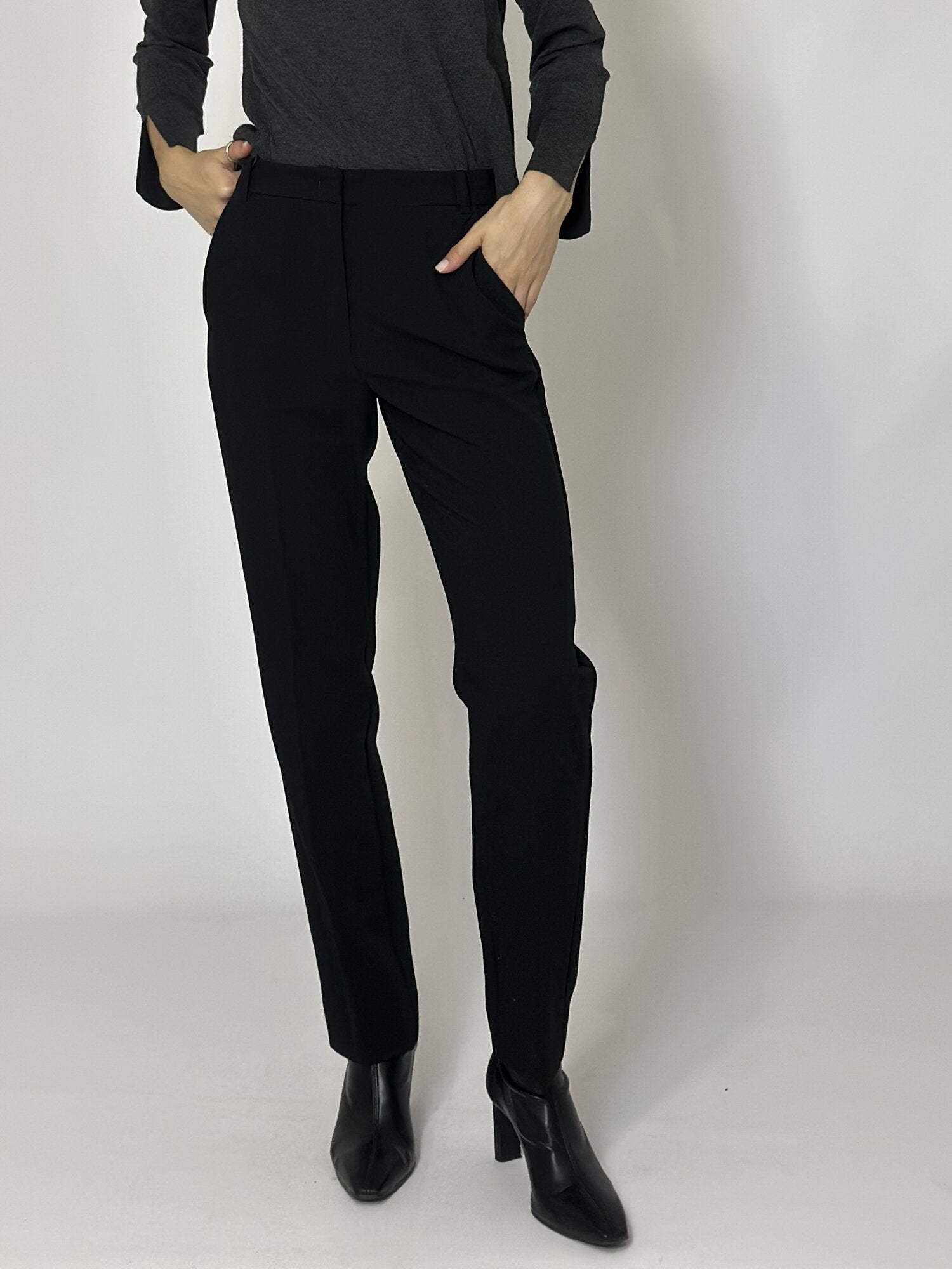 Pantalone chino Eresia Nero di Emme di Marella. Pantalone in tessuto doppio stretch dal Fit regolare. Linea a chino con allacciatura nascosta. Tasche laterali alla francese. Piega stirata fronte e retro. Disponbile in panna e nero.