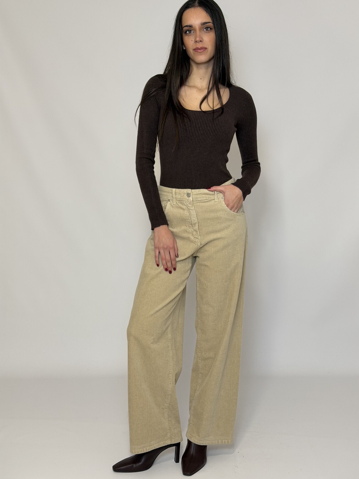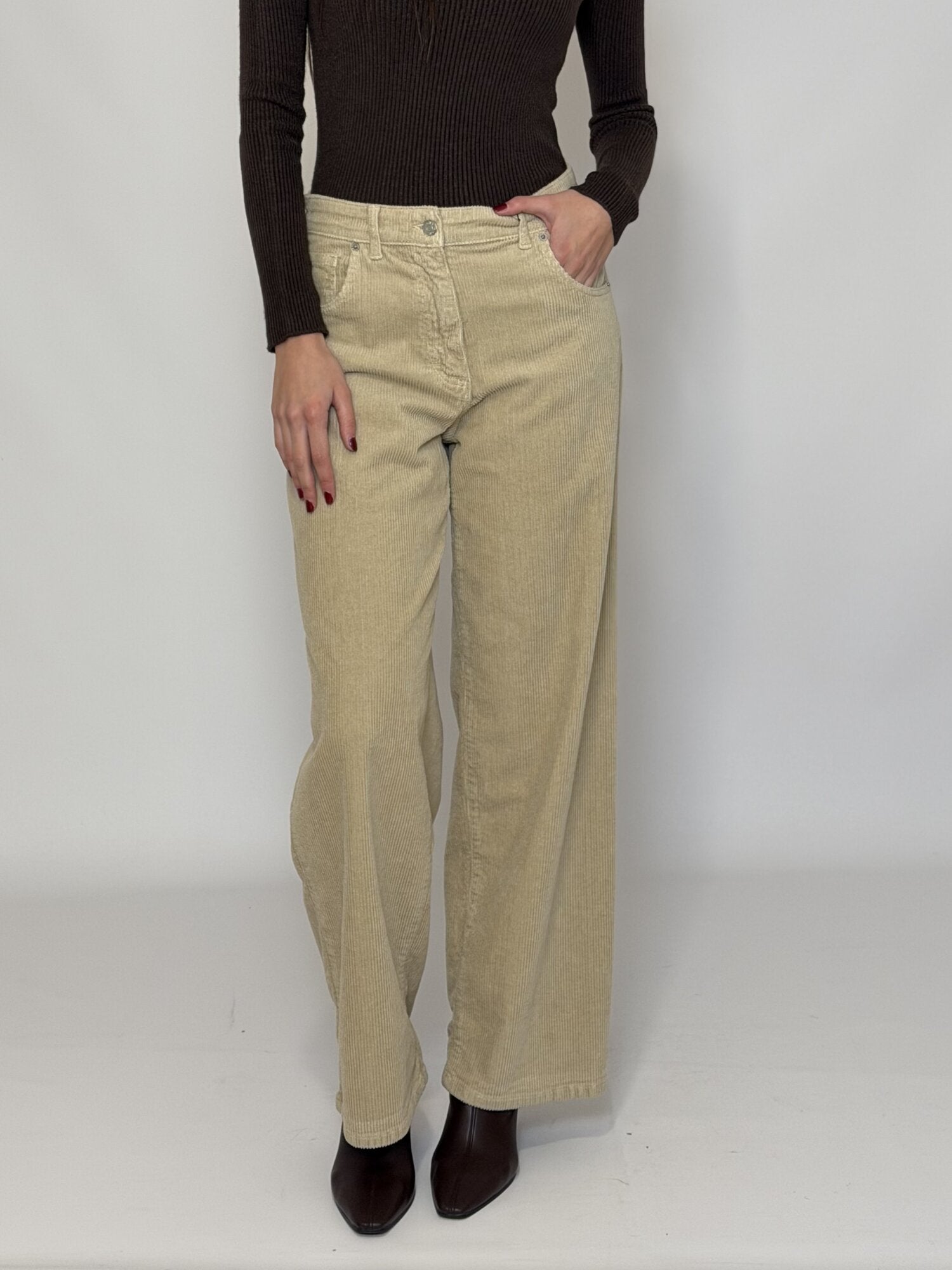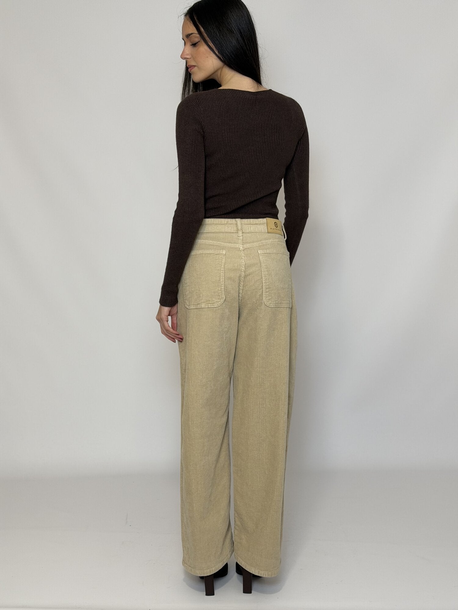 Pantalone Velluto Costine Beige di Haveone. Pantalone in velluto a costine a vita alta, modello palazzo a 5 tasche. Passanti per cintura in vita e chiusura con cerniera e bottone. Disponibile in beige e moro.