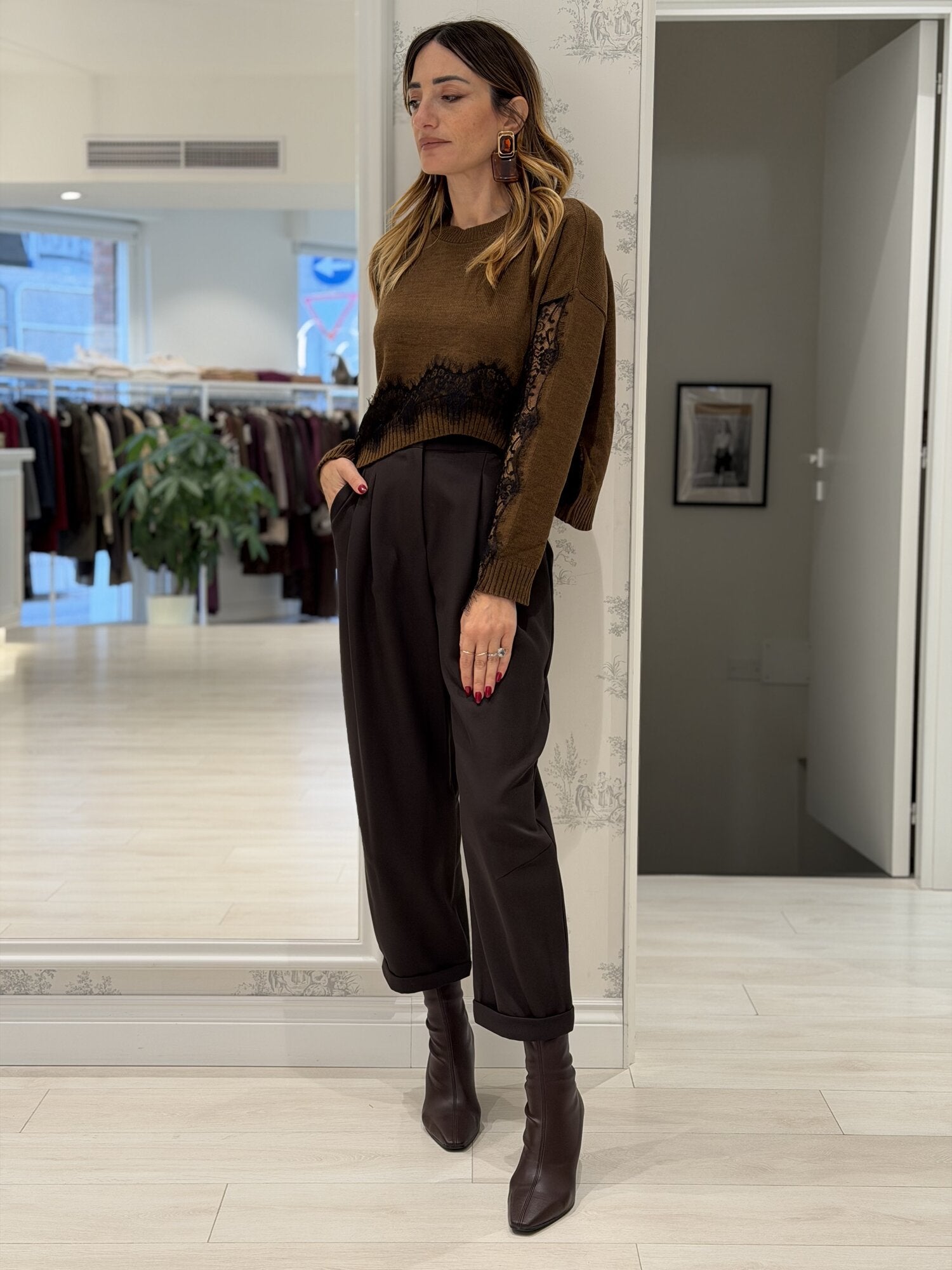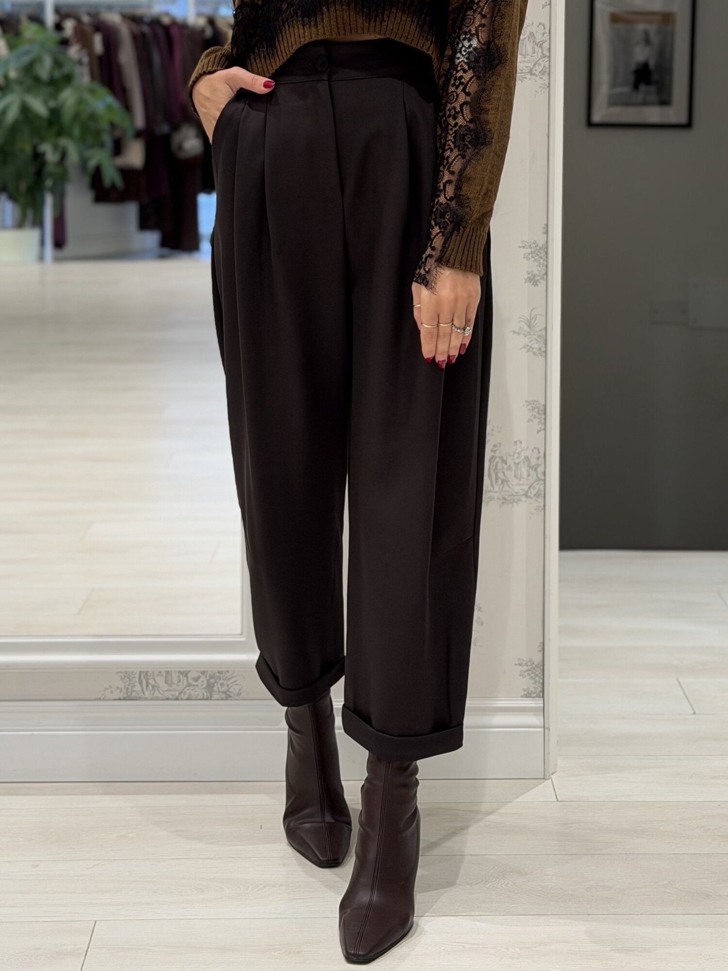 Pantalone con pences moro di Vicolo. Pantalone balloon in punto milano. Pantaloni a vita alta con vestibilità morbida. Dettaglio di pieghe sul davanti e risvolto. Chiusura con bottone. Tasche a filetto sui lati e risvolto sull'orlo. Disponibile in verde bosco, marrone, moro, blu notte e nero.