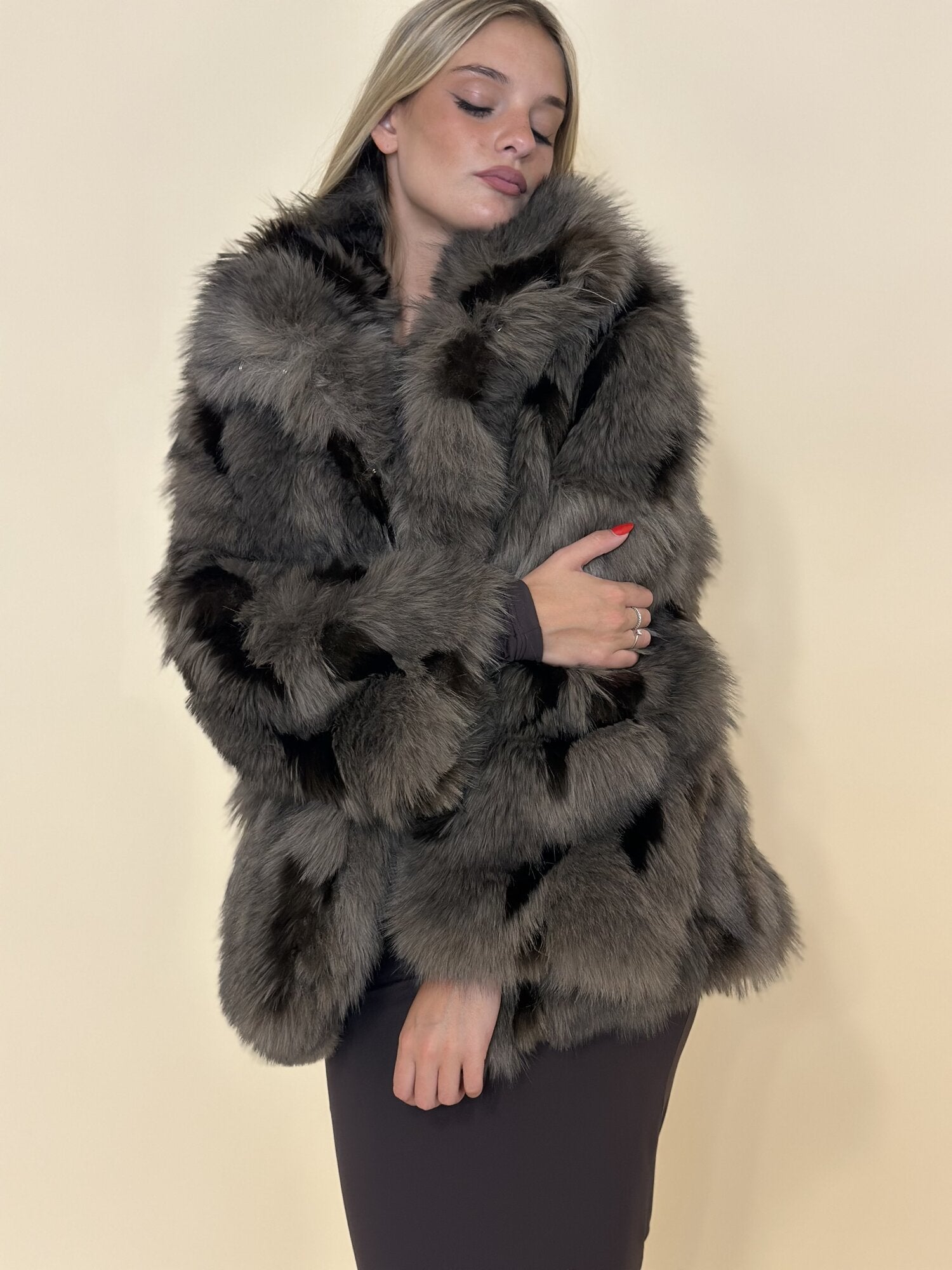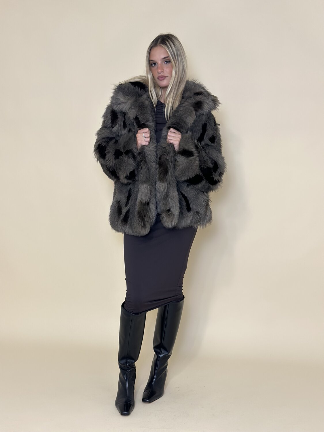 Pelliccia Rever Maculata moro di Haveone. Pelliccia oversize maculata con collo alto reverse. Tasche nascoste laterali. Chiusura con ganci. Foderata. Disponibile in moro.