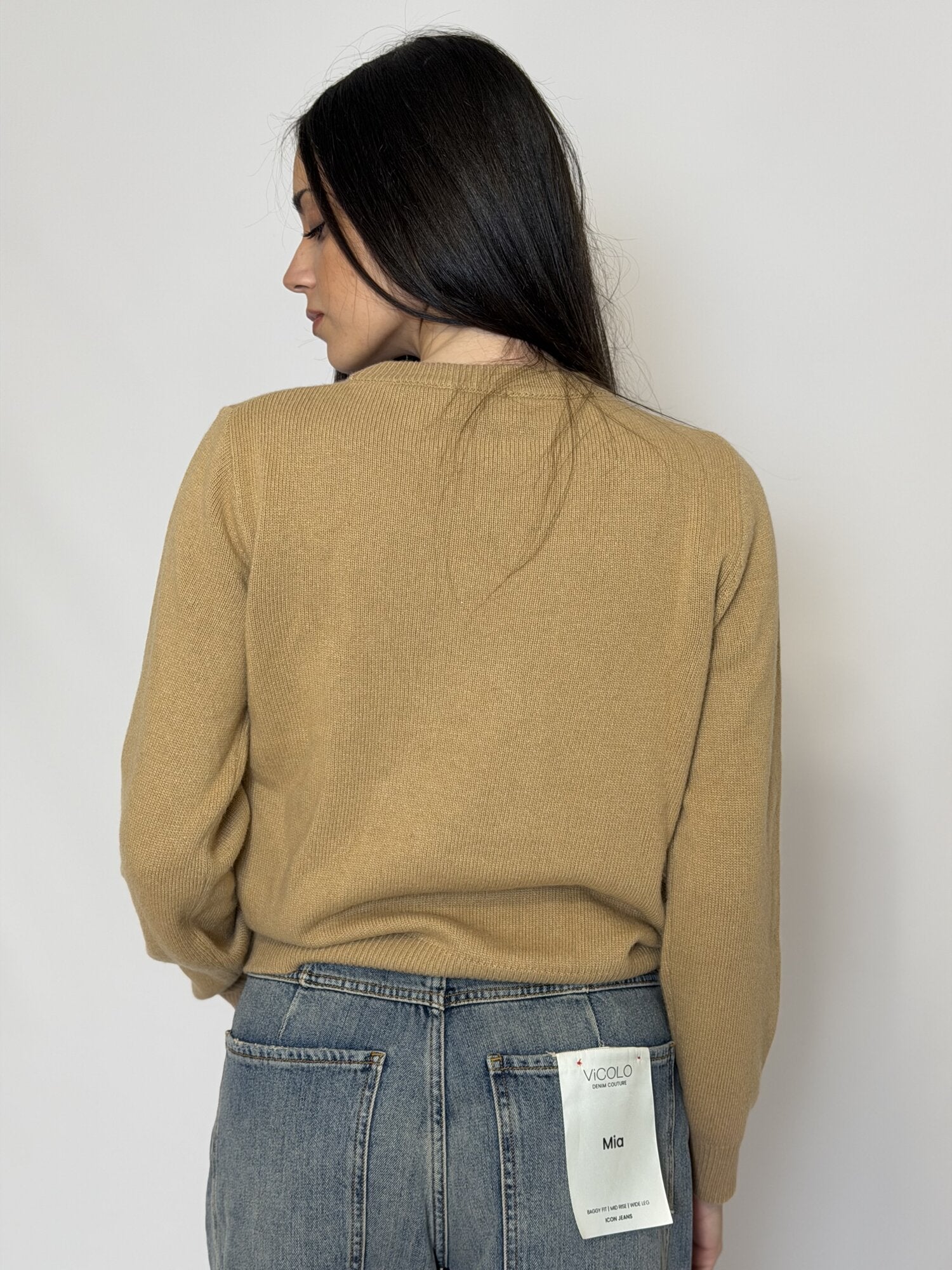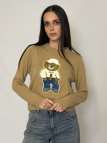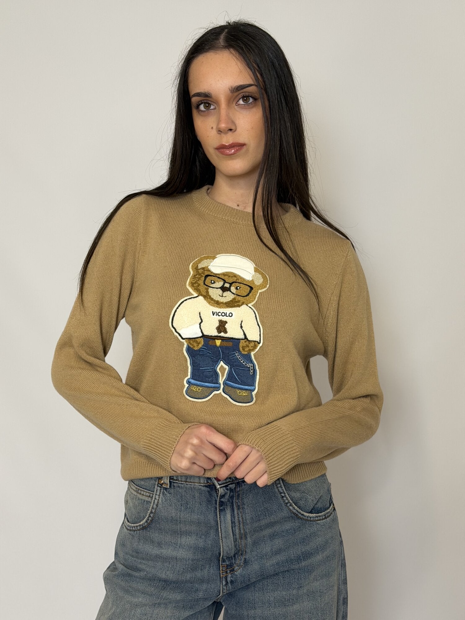 Pullover a girocollo con patch Orsetto Teddy cammello di Vicolo. Maglione in maglia fine a tinta unita. Vestibilità regular con scollo girocollo e polsini a costine. Patch ricamata di un orsetto teddy vestito con cappello, occhiali, maglietta con la scritta "VICOLO" e jeans. Disponibile in cammello, moro e nero.