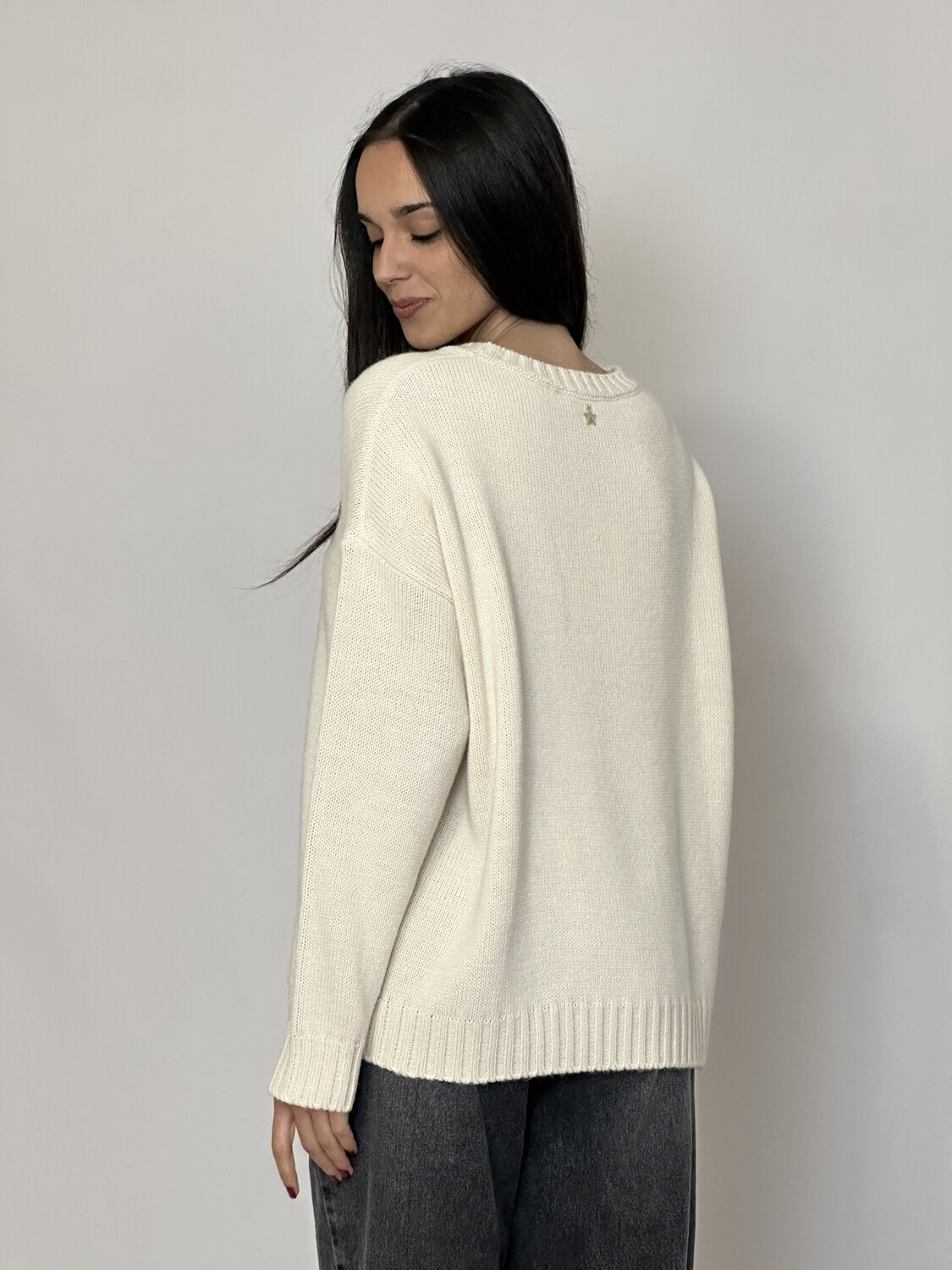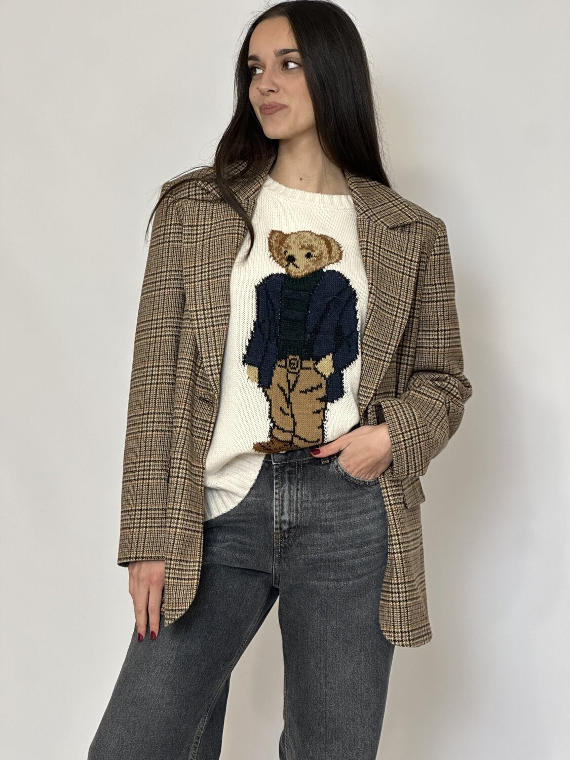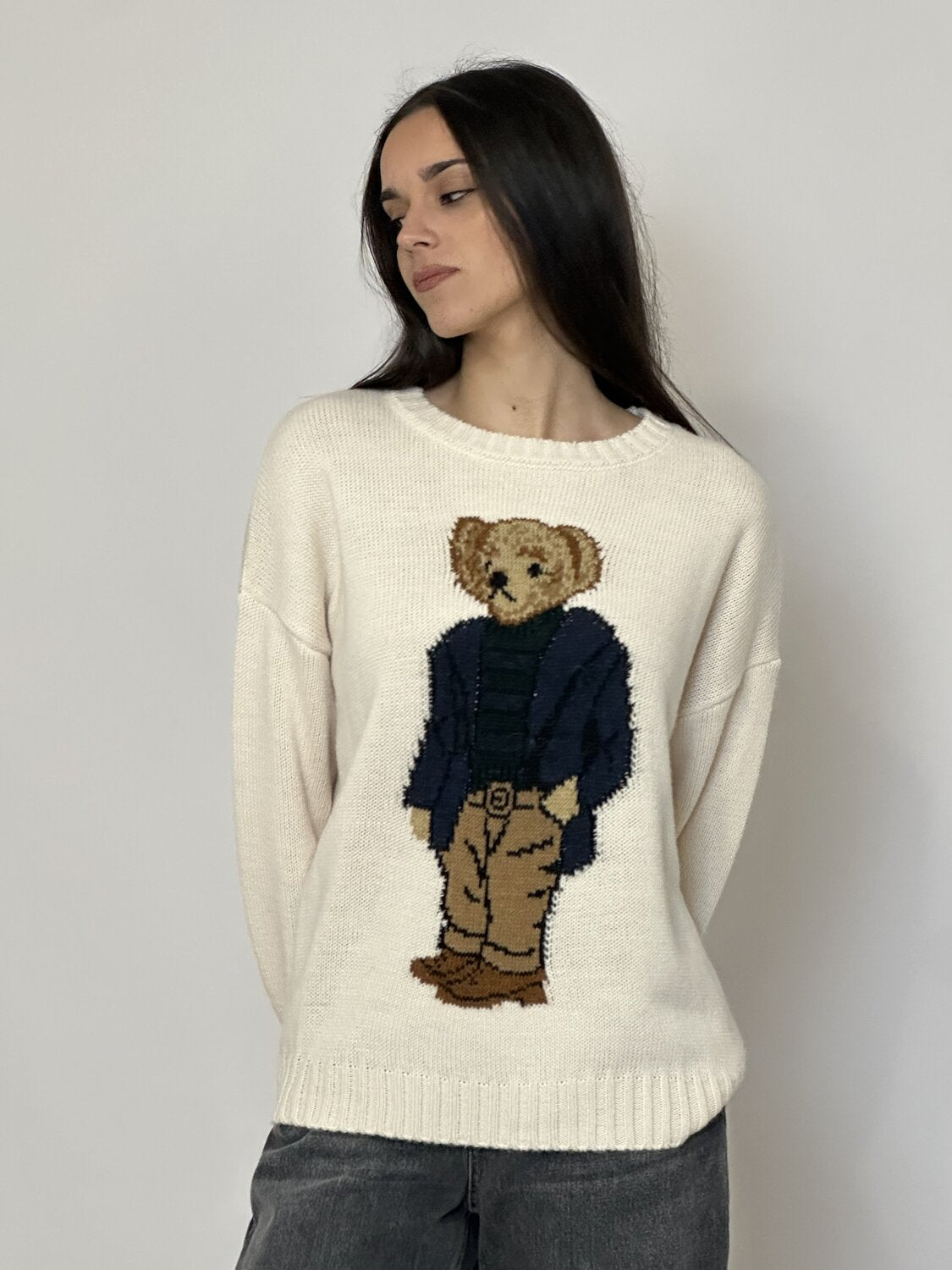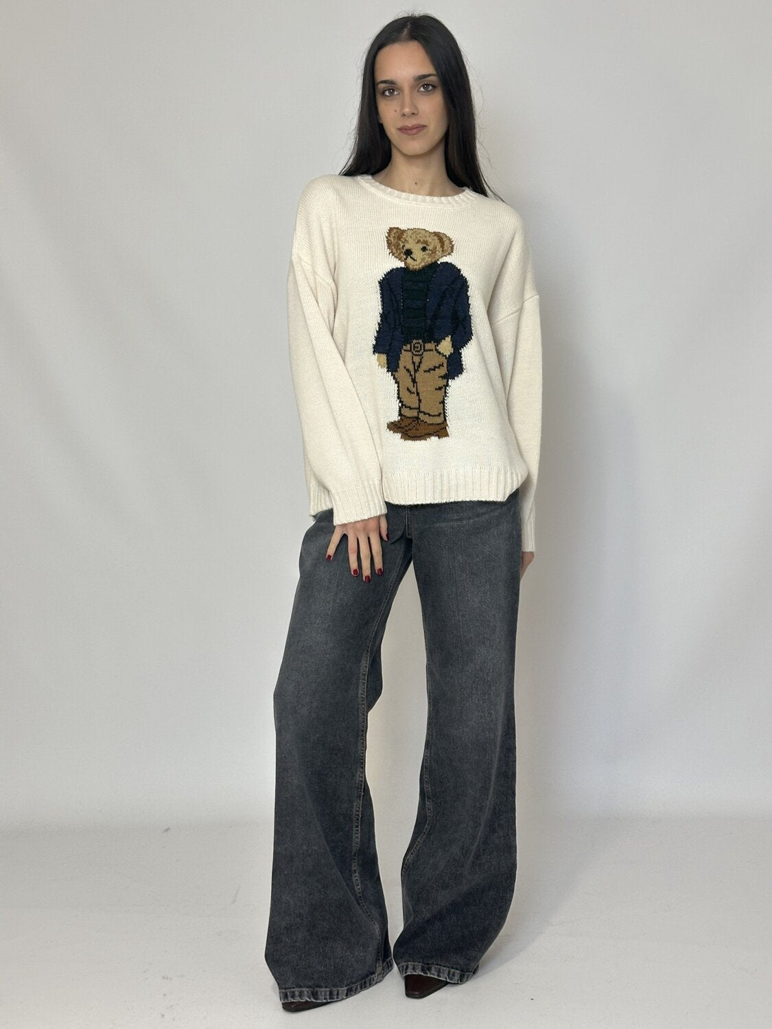 Pullover oversize orsetto panna di Souvenir. Maglione a girocollo con vestibilità oversize. Realizzato in maglia grossa in tinta unita. Orsetto teddy vestito con giacca e pantaloni. Disponibile in verde scuro, blu, panna, moro, grigio e nero.