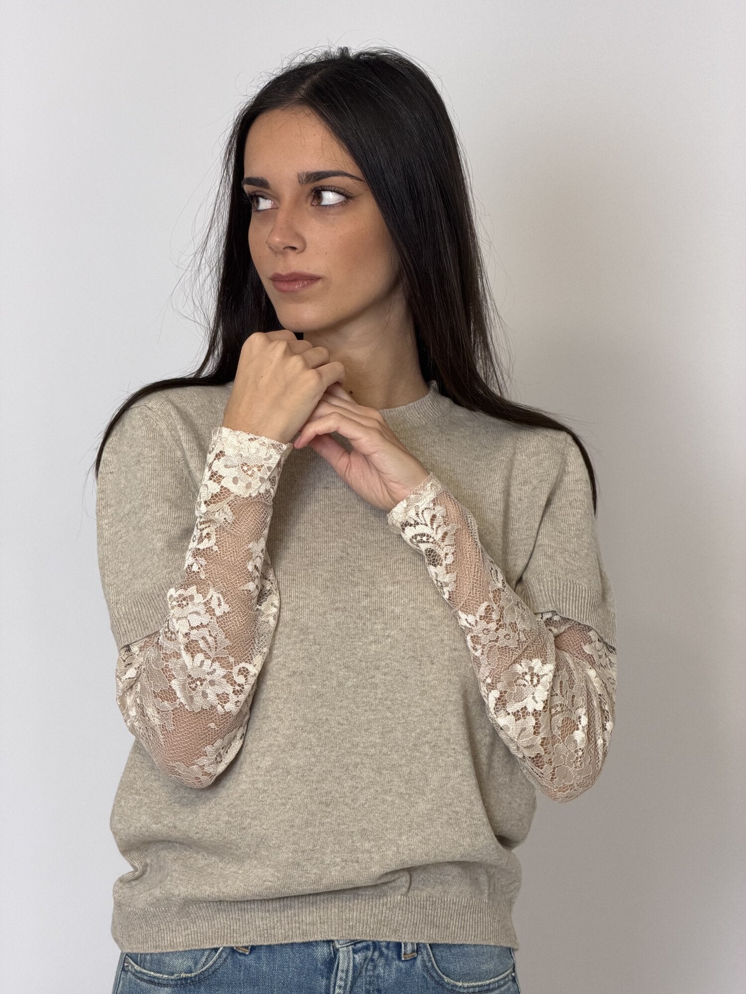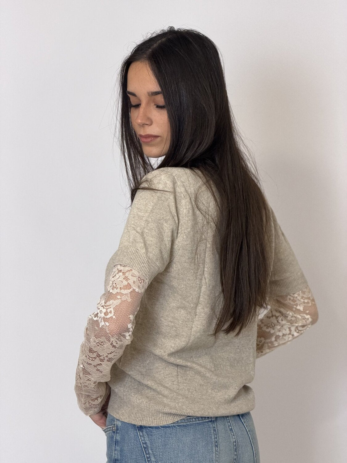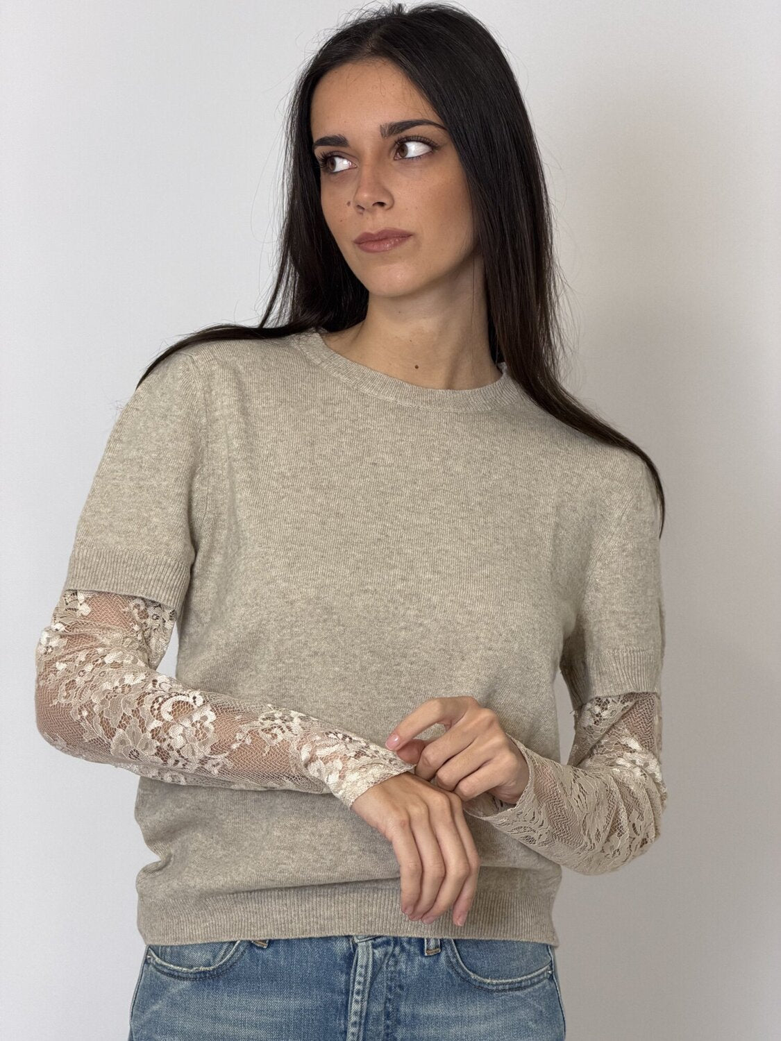 Maglia girocollo con maniche in pizzo beige di Vicolo. Pull a maniche corte in maglia rasata con collo tondo. Maniche corte con inserto in pizzo tono su tono trasparente. Vestibilità morbida e destrutturata. Disponibile nel colore nero, grigio, beige, vinaccio e panna.