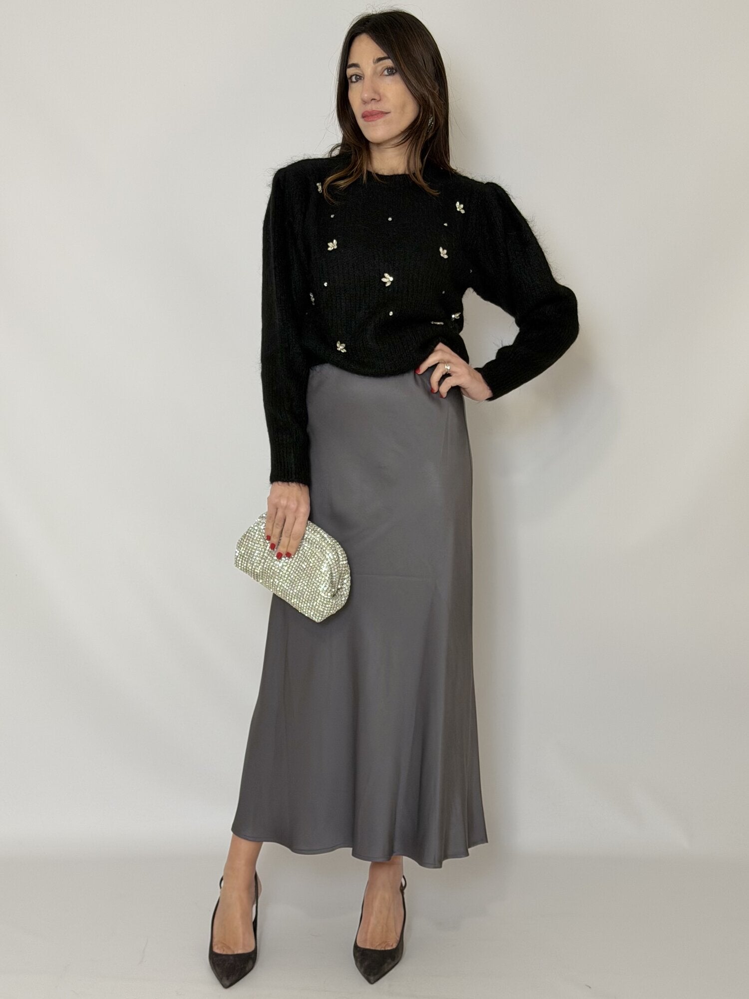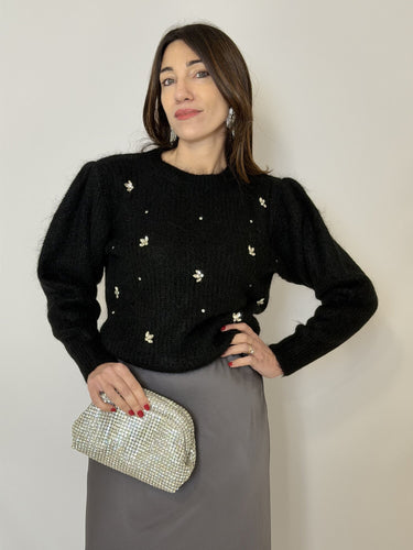 Pullover strass nero di Vicolo. Pullover girocollo a maniche lunghe con spalla a sbuffo. Strass applicati. Disponibile in nero e in panna.