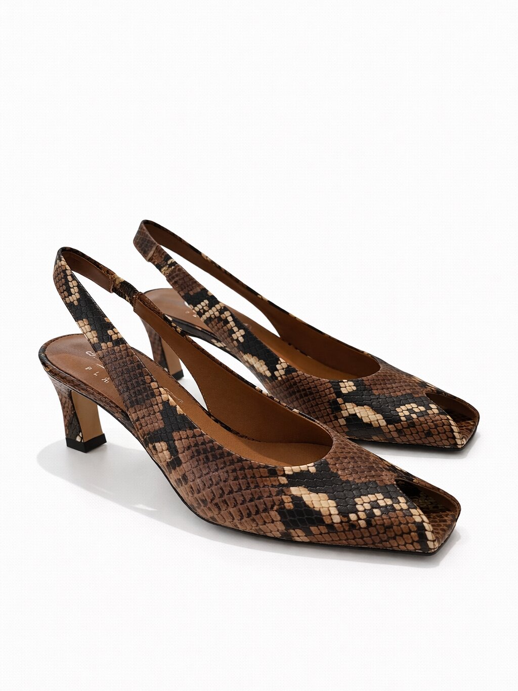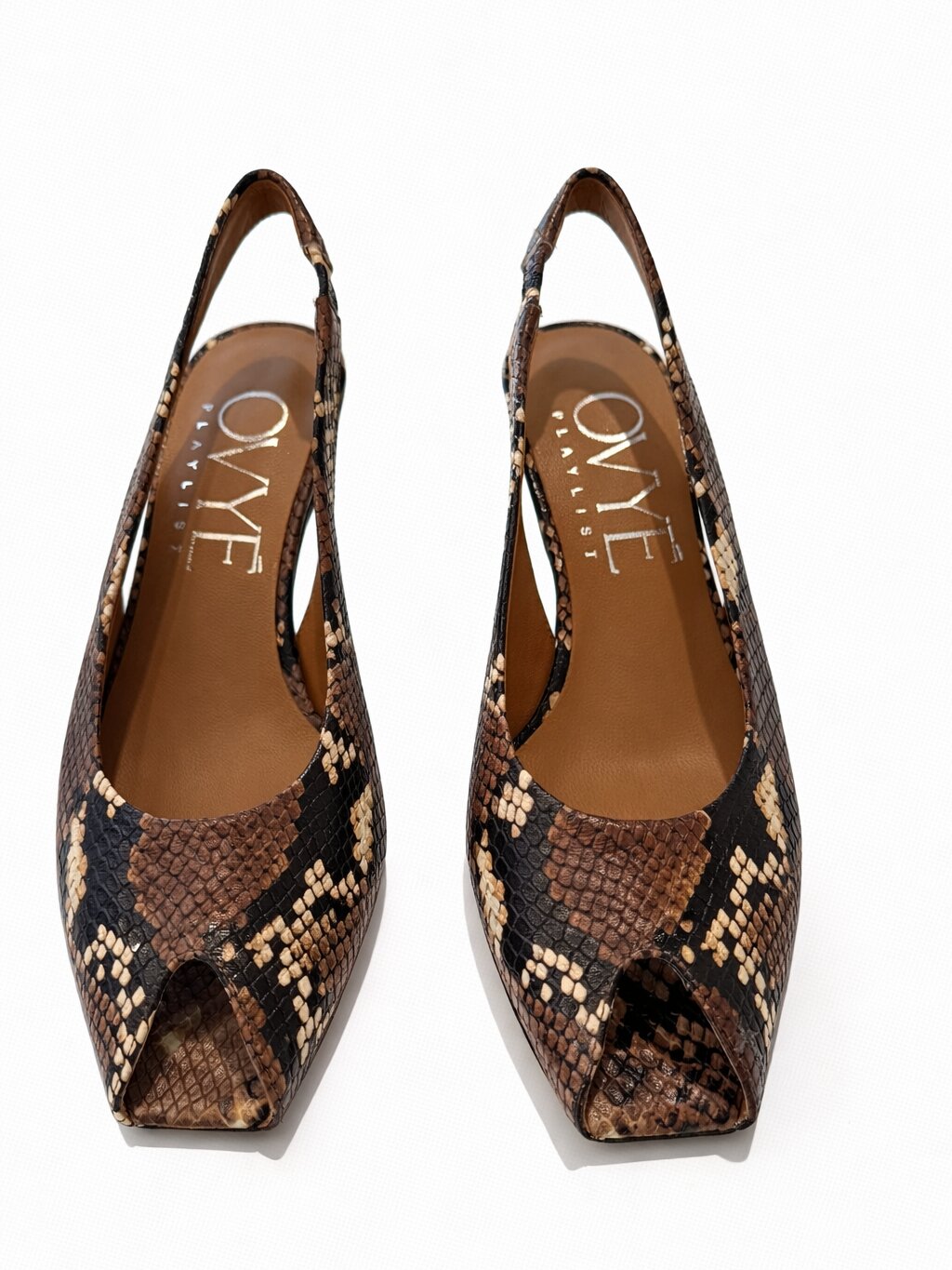 Slingback Stampa Pitone Moro di Ovyé. Scarpa modello slingback con punta aperta. La base della punta ha una forma leggermente squadrata.