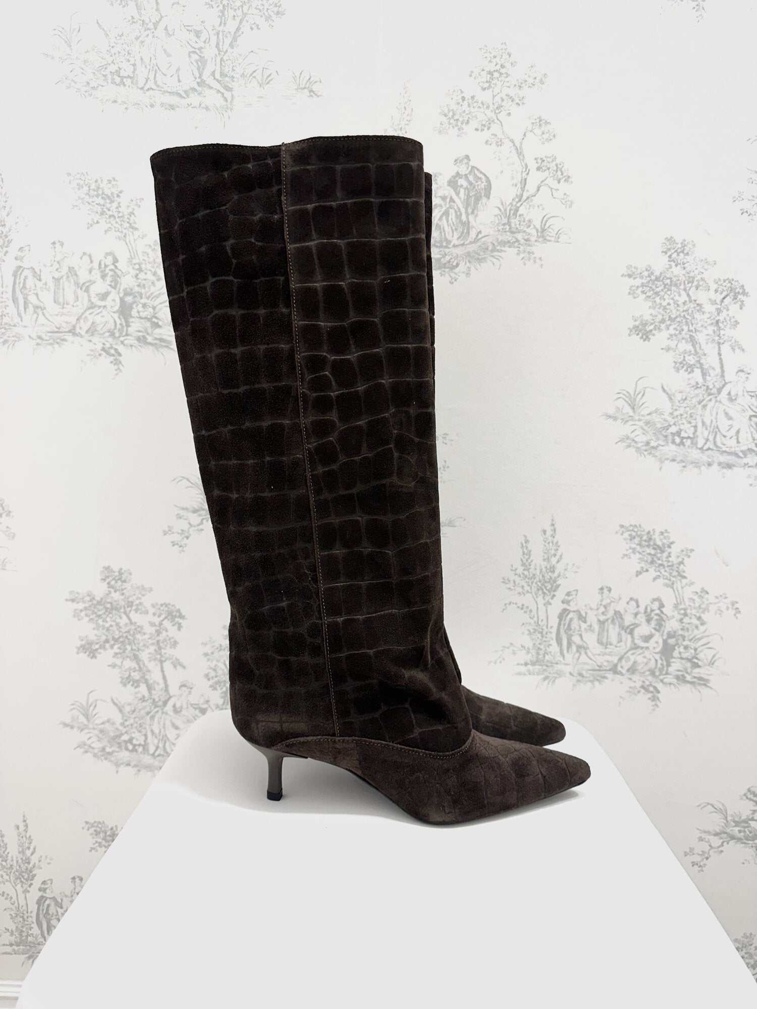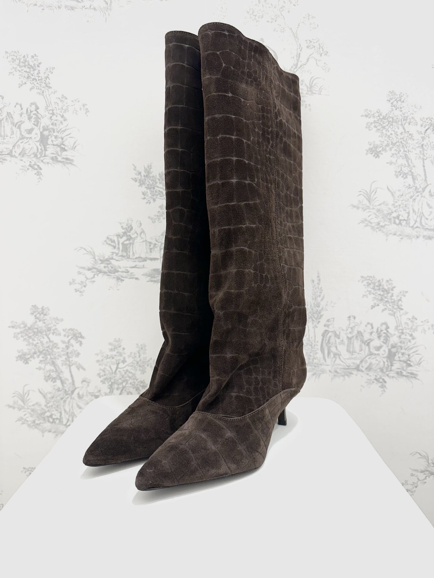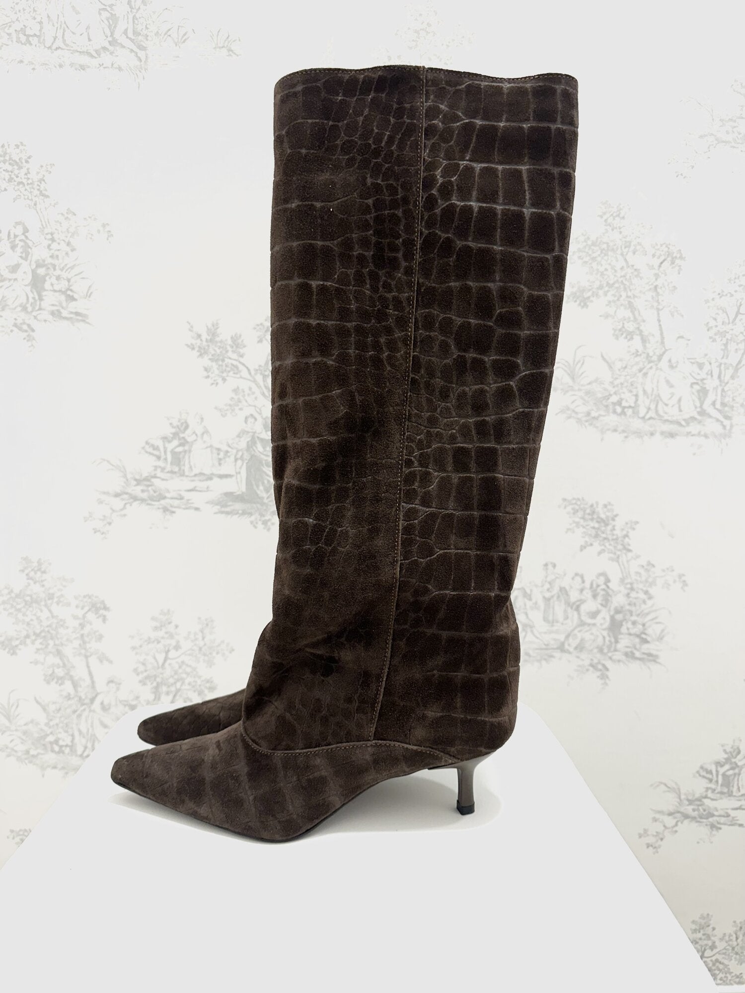 Stivale Alto Cocco Camoscio Moro di Ovyé. Stivale a punta in camoscio effetto cocco con tacco. Gambale alto. Altezza tacco 5 cm. Disponibile in moro.