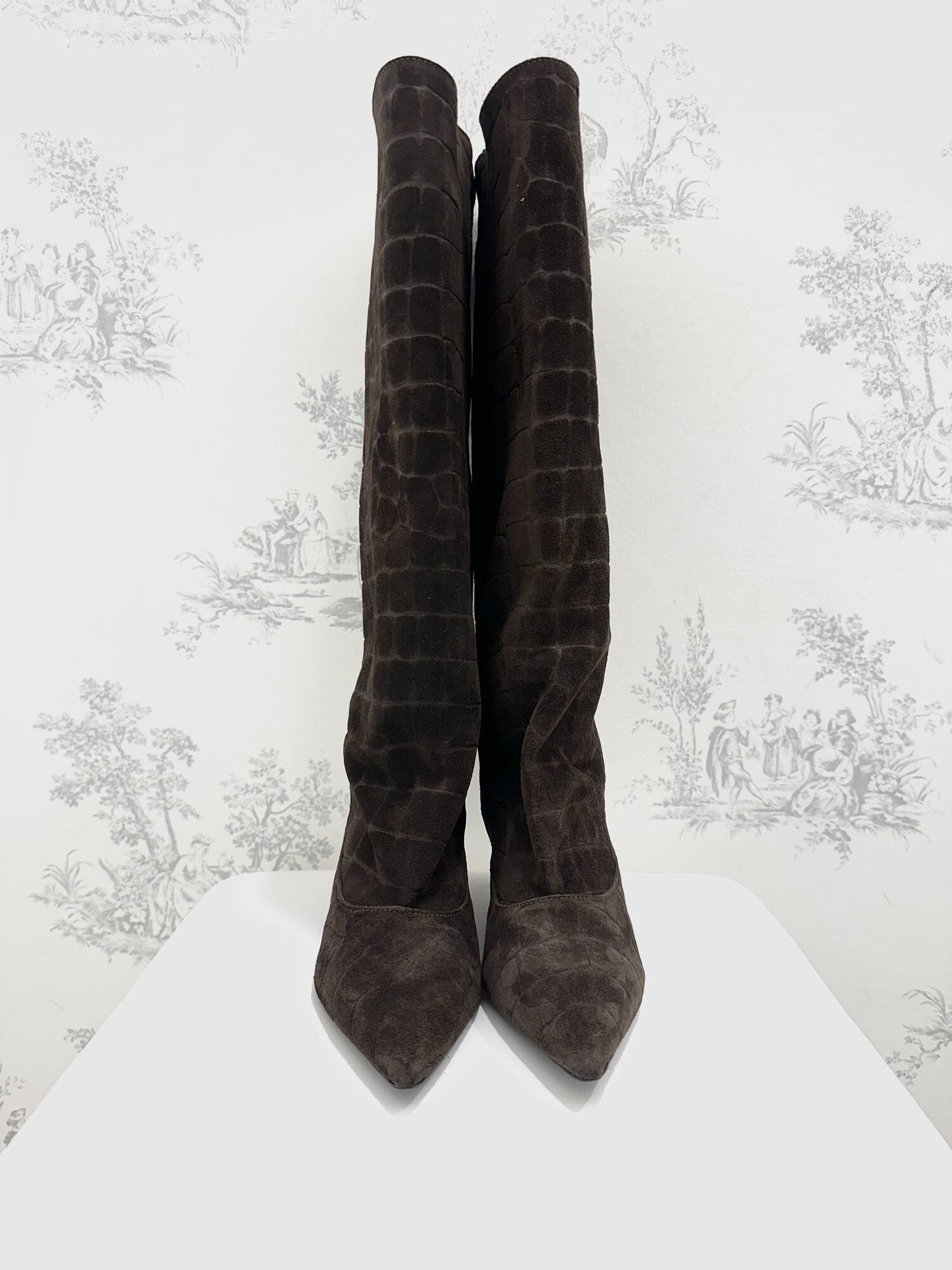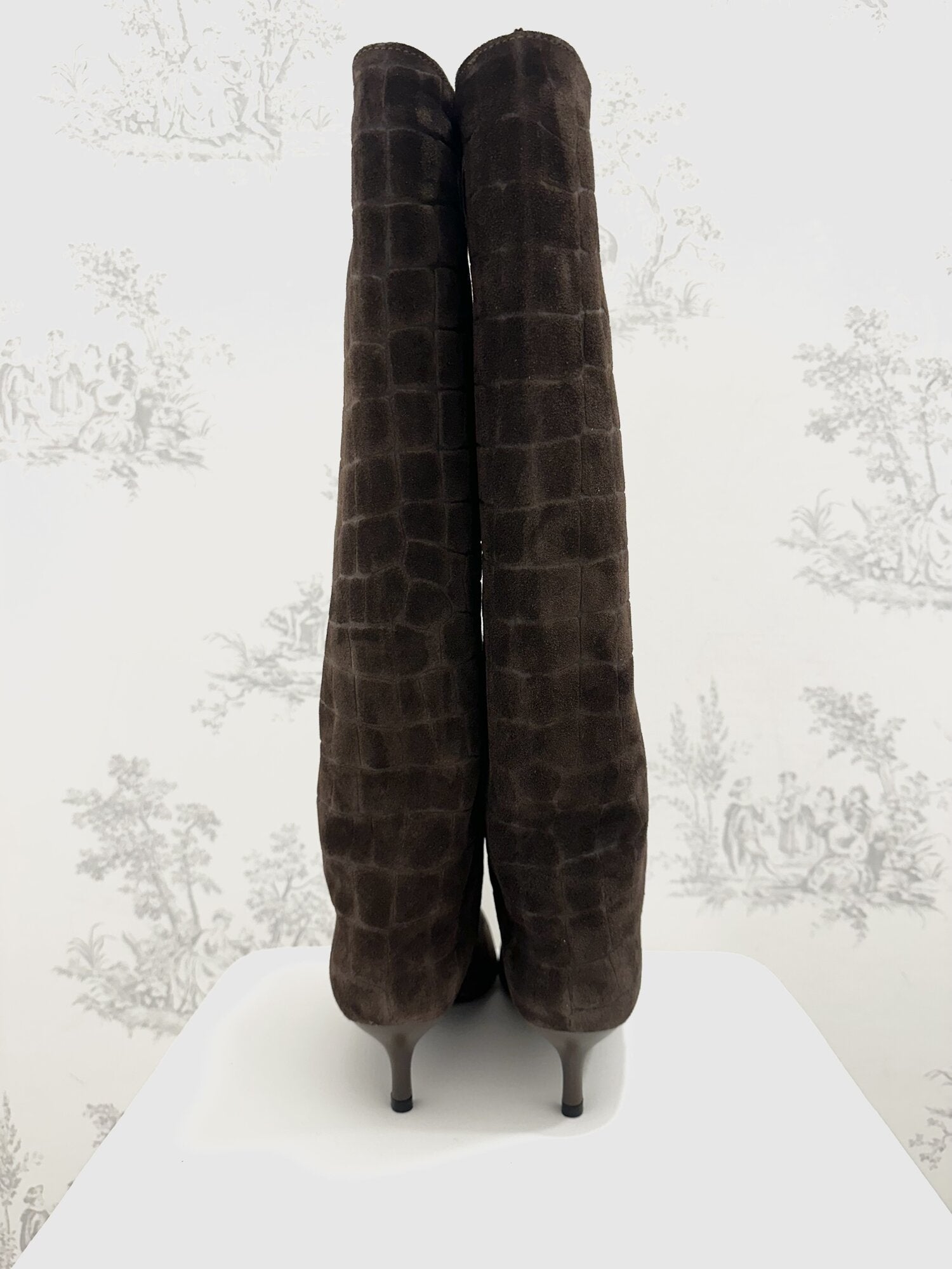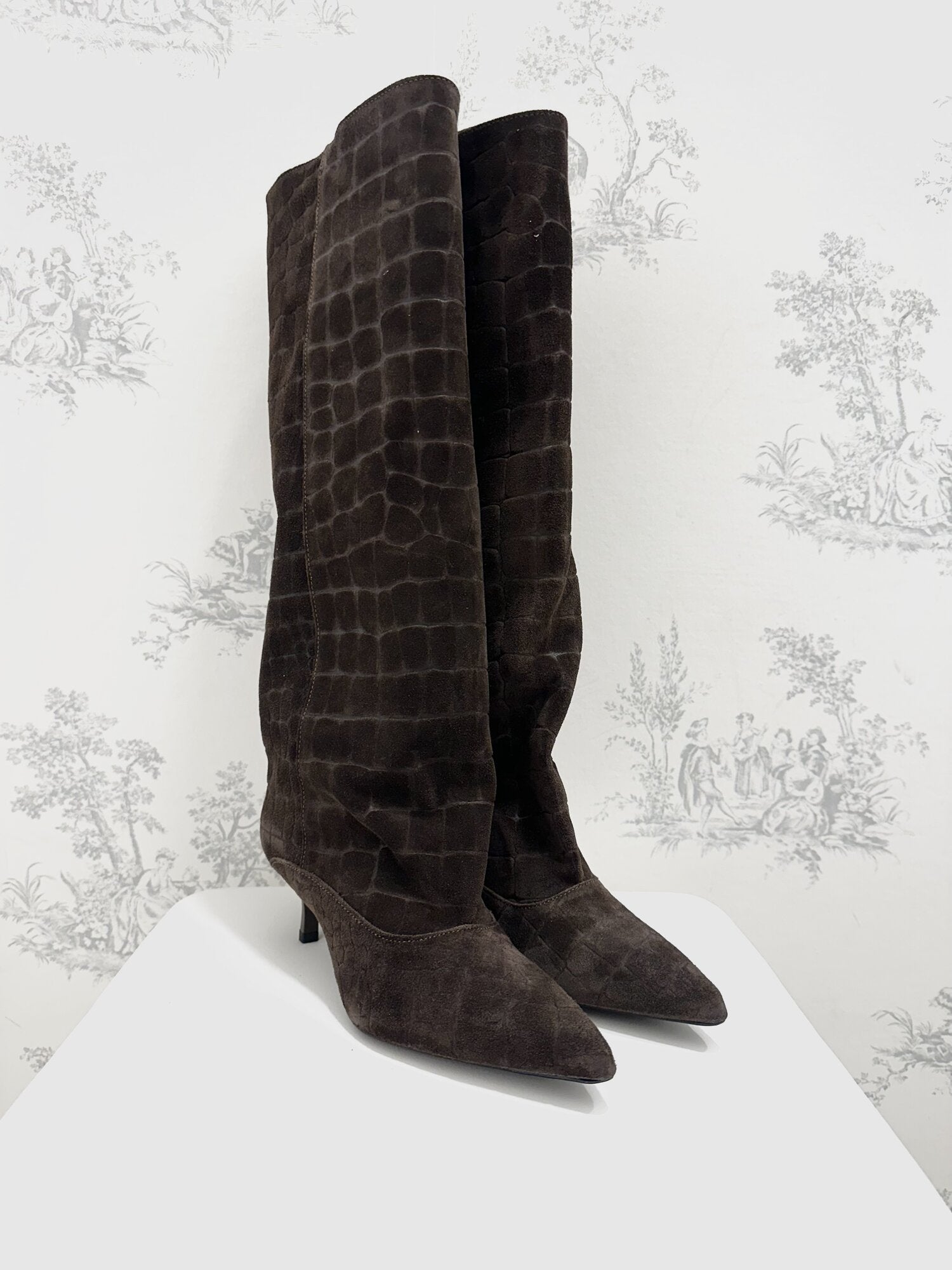 Stivale Alto Cocco Camoscio Moro di Ovyé. Stivale a punta in camoscio effetto cocco con tacco. Gambale alto. Altezza tacco 5 cm. Disponibile in moro.