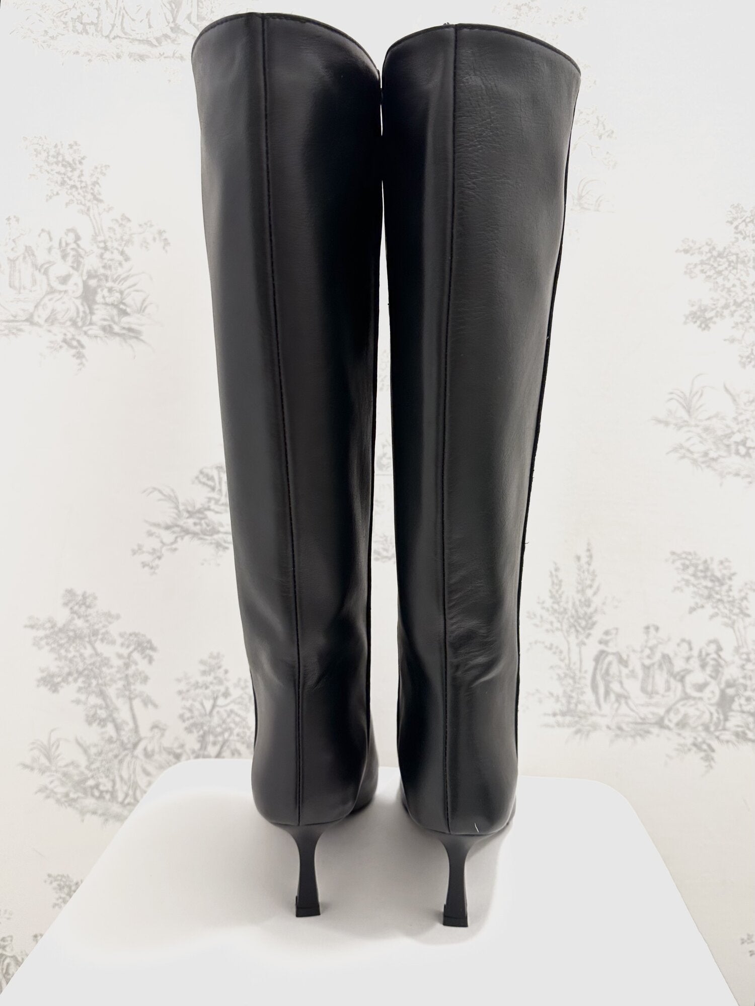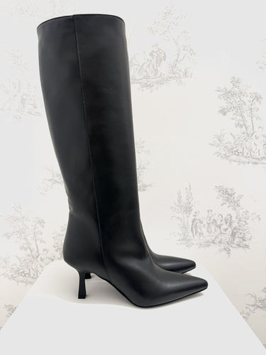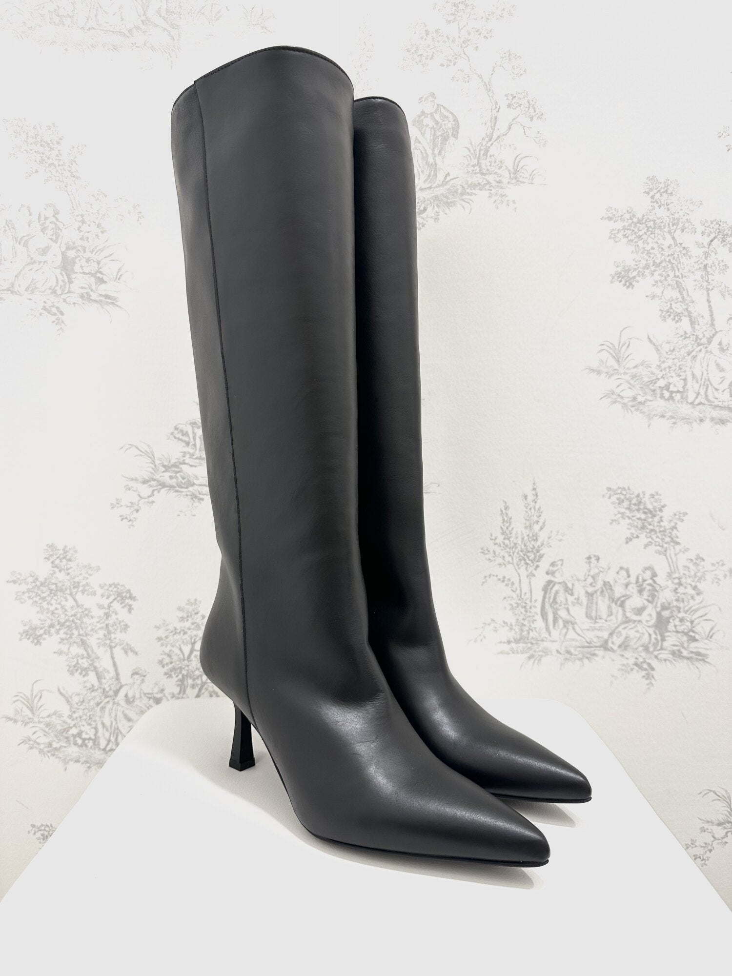 Stivale alto a punta di Ovyé. Stivale a punta in pelle con gambale alto tubolare e tacco. Altezza tacco 8 cm. Disponibile in nero.