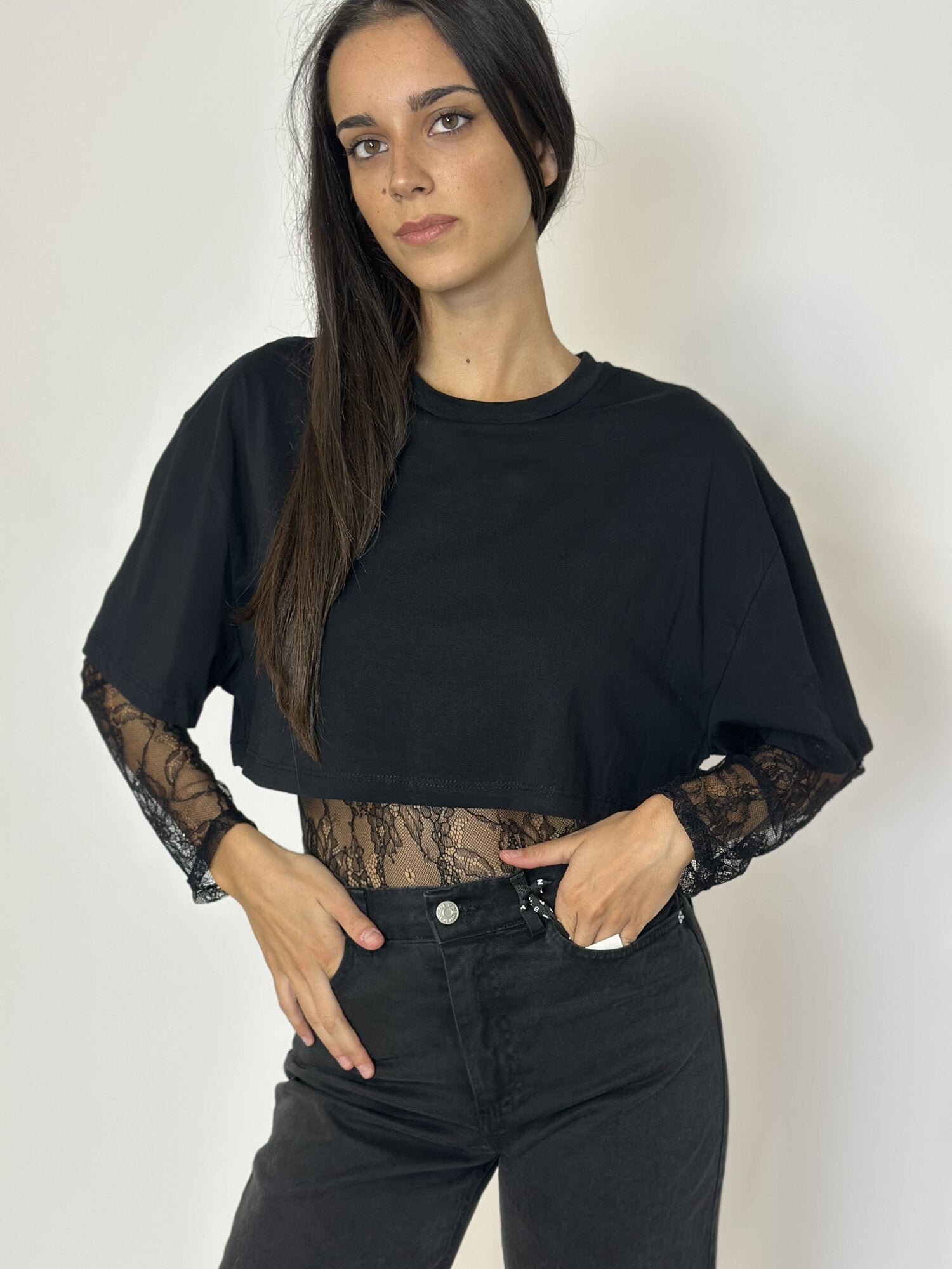 Tshirt crop con body in pizzo nero di Haveone . T-shirt crop in cotone con scollo rotondo. Maniche lunghe in pizzo a contrasto. Dettaglio di body incorporato in pizzo e vestibilità aderente. Disponibile nel colore nero e burro.
